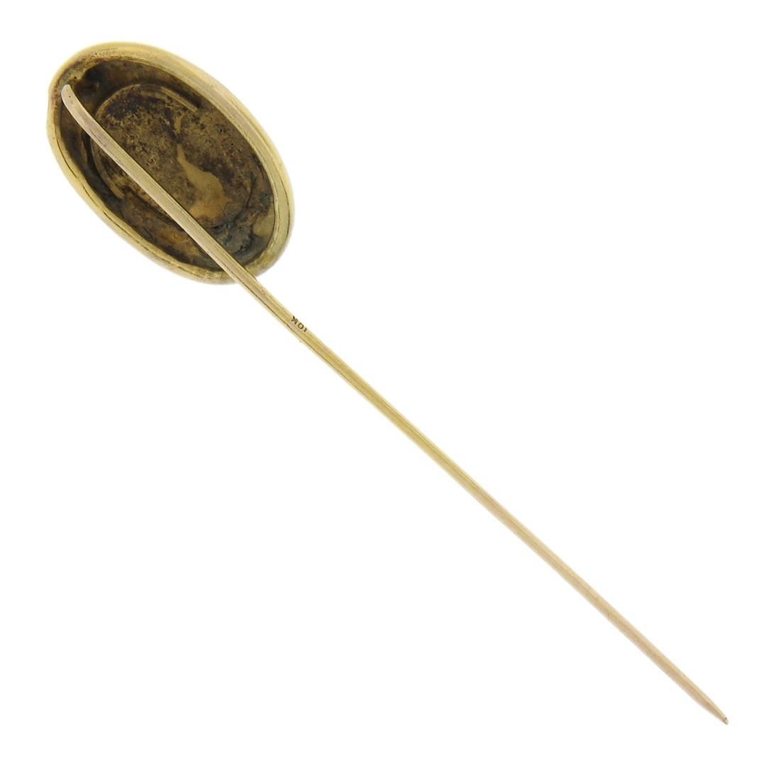 An antique solid 10k yellow gold stick pin, with 1 oval shape carved cameo hardstone (9.5x6.7mm). Measures 59.7x12.5mm and weighs a total of 1.83 grams.