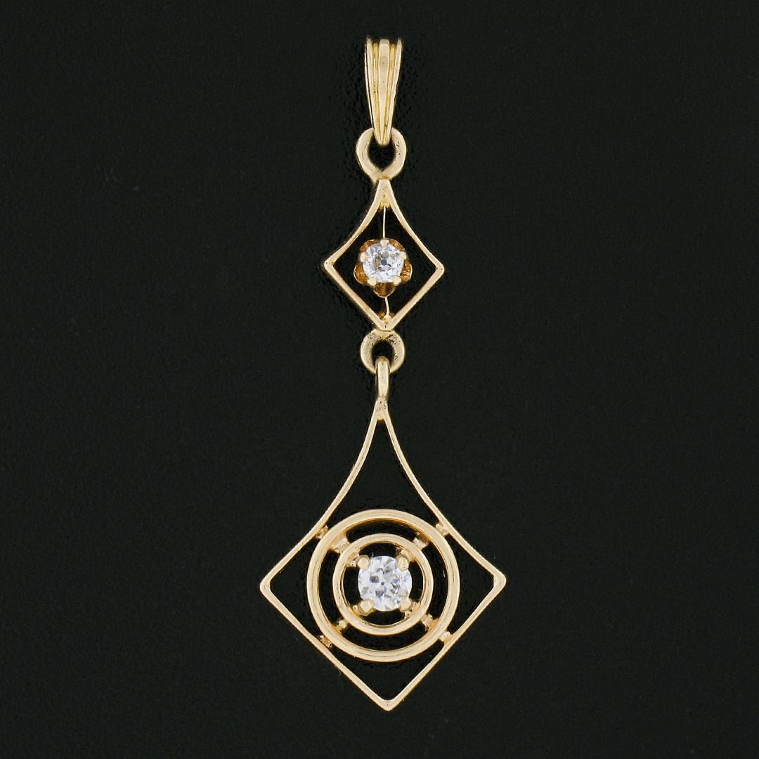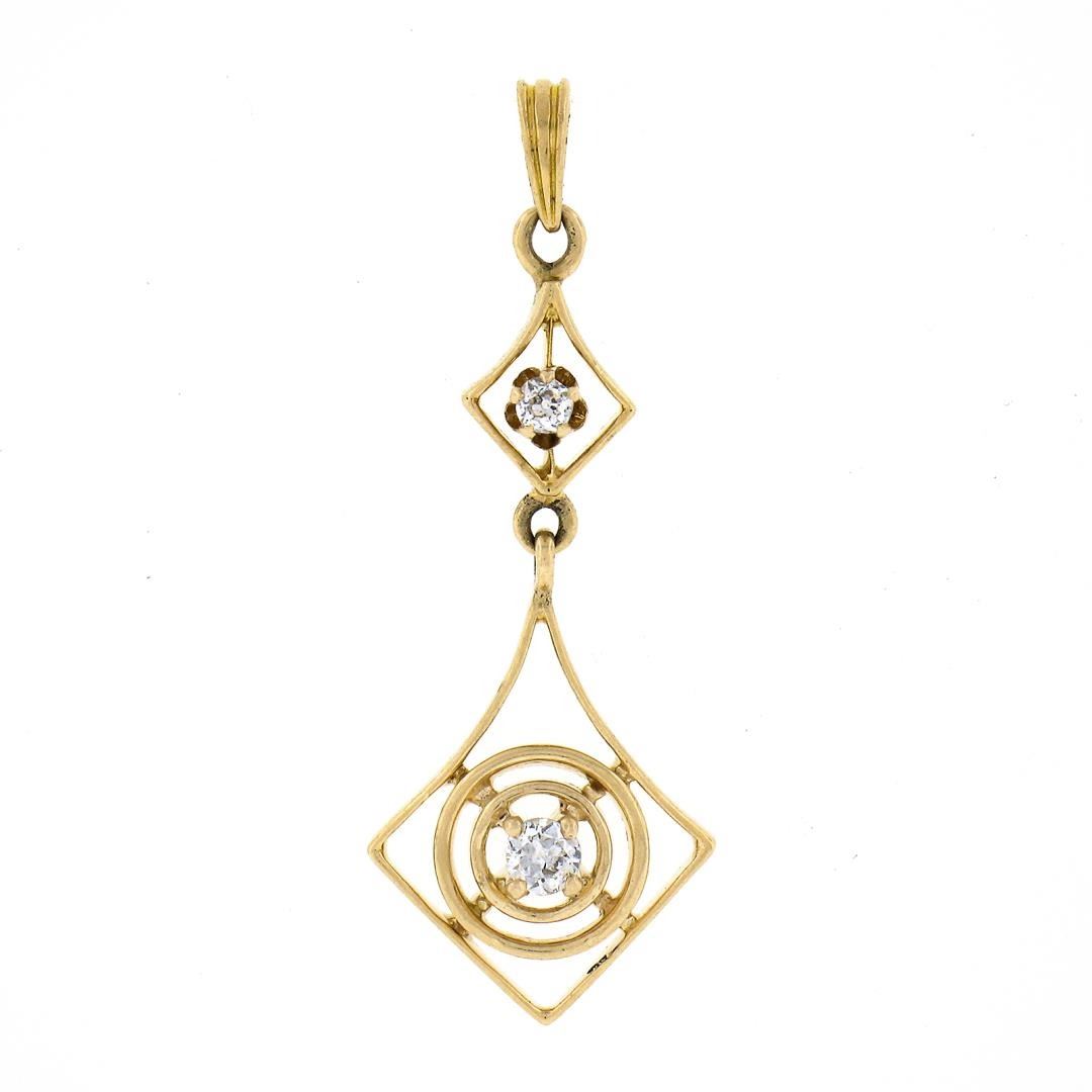 An antique solid 14k yellow gold lavalier pendant, with 2 old mine cut natural diamonds (G/H - VS2 ; 0.12ctw). The pendant weighs a total of 1.25 grams, measures 34.50x12.70mm including the bail, and the inside of the bail measures 4x3mm.
