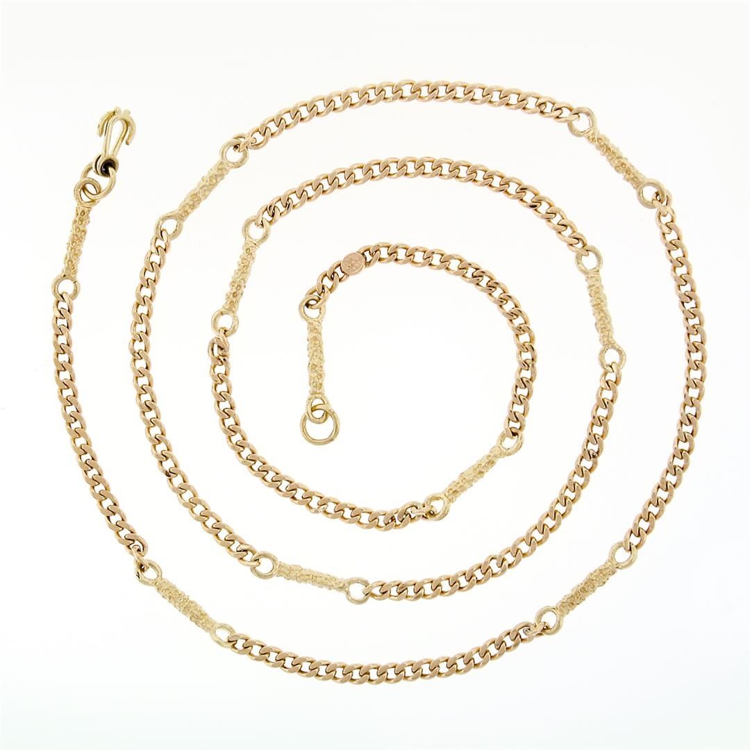 A solid 14k yellow gold curb Cuban with station bar link chain necklace. It weighs a total of 19.73 grams, measures 4.25mm wide, and measures 25 inches in length.