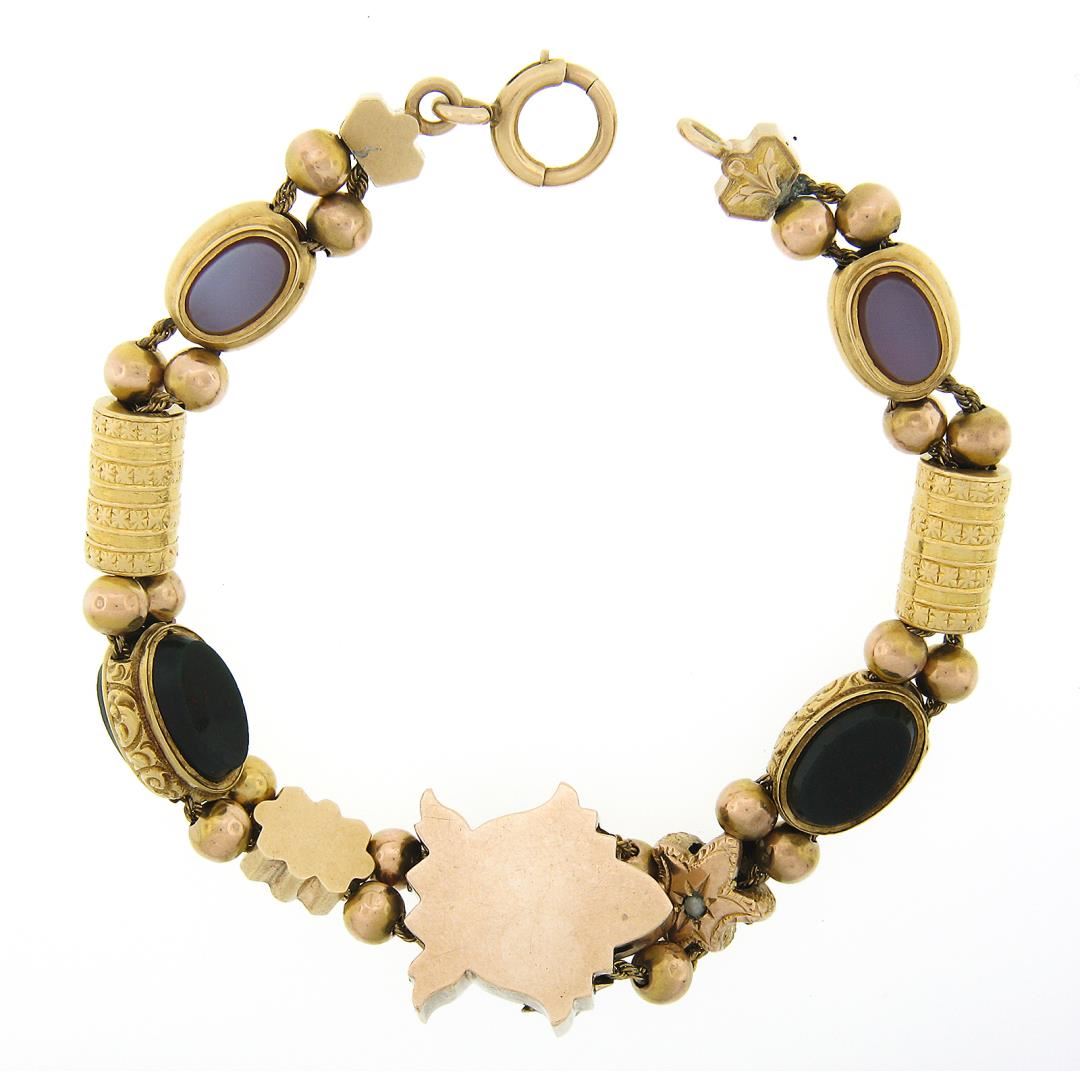 An antique solid 14+k yellow gold charm bracelet, with 1 oval shape cameo natural agate (10.9x8.3mm), and 4 oval cut natural agates (8.6x5.5mm each ), with 4 oval cut natural bloodstones ( 11.6x7.3mm each), and 3 round shape cultured seed pearls (1.2mm each). It weighs a total of 24.25 grams, measures 18.5mm wide, and measures 7 inches in length.