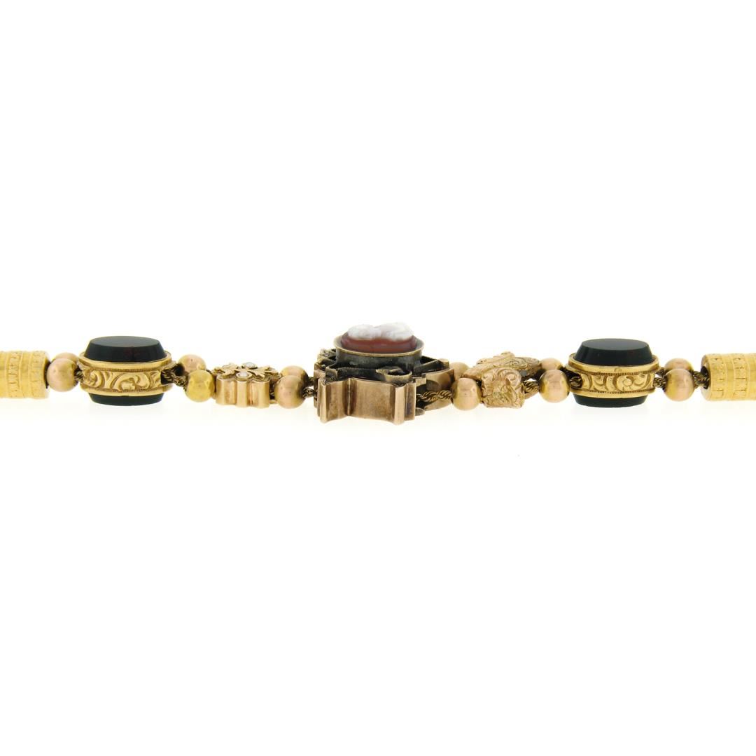 An antique solid 14+k yellow gold charm bracelet, with 1 oval shape cameo natural agate (10.9x8.3mm), and 4 oval cut natural agates (8.6x5.5mm each ), with 4 oval cut natural bloodstones ( 11.6x7.3mm each), and 3 round shape cultured seed pearls (1.2mm each). It weighs a total of 24.25 grams, measures 18.5mm wide, and measures 7 inches in length.