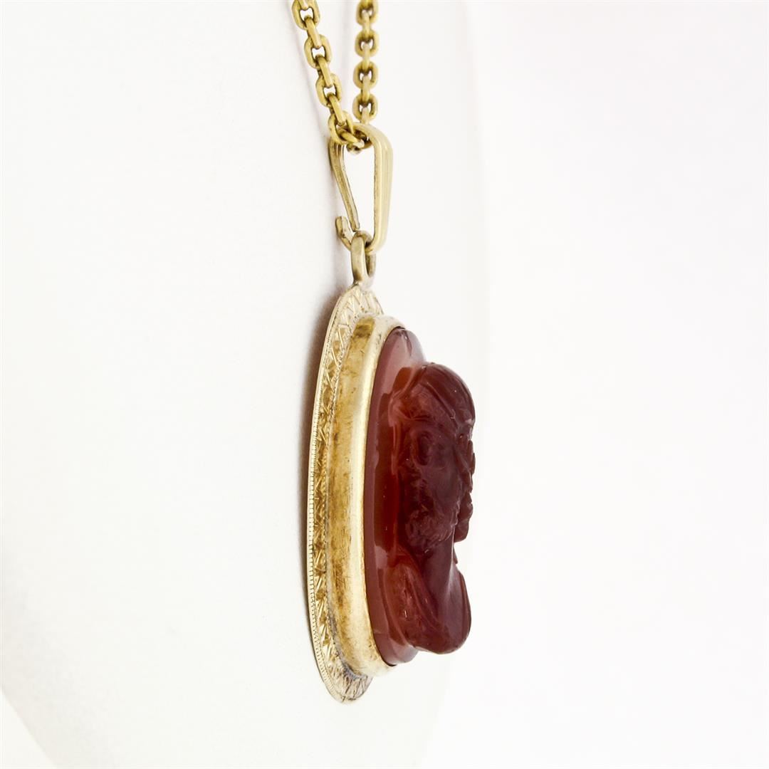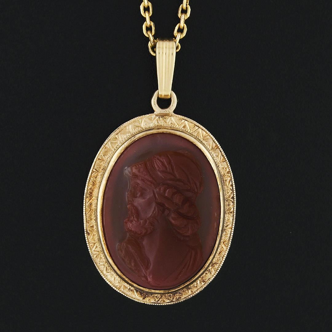 An antique solid 14k yellow gold pendant necklace, with 1 oval shape natural carved cameo carnelian (20.6x15.5mm). The pendant weighs a total of 9.57 grams, measures 35.1x20.5mm including the bail, and 20 inch cable link chain.