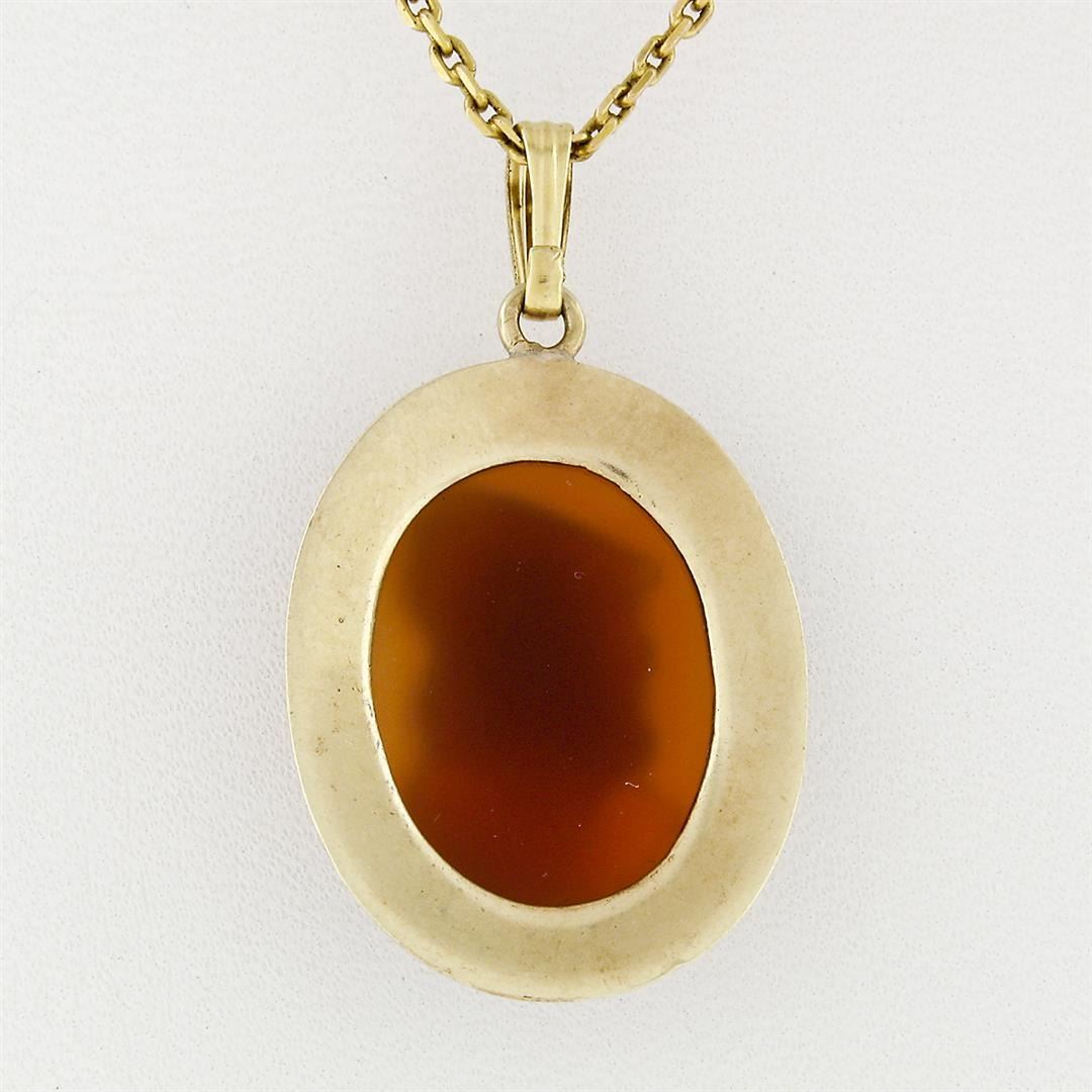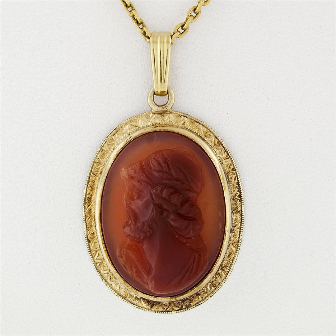 An antique solid 14k yellow gold pendant necklace, with 1 oval shape natural carved cameo carnelian (20.6x15.5mm). The pendant weighs a total of 9.57 grams, measures 35.1x20.5mm including the bail, and 20 inch cable link chain.