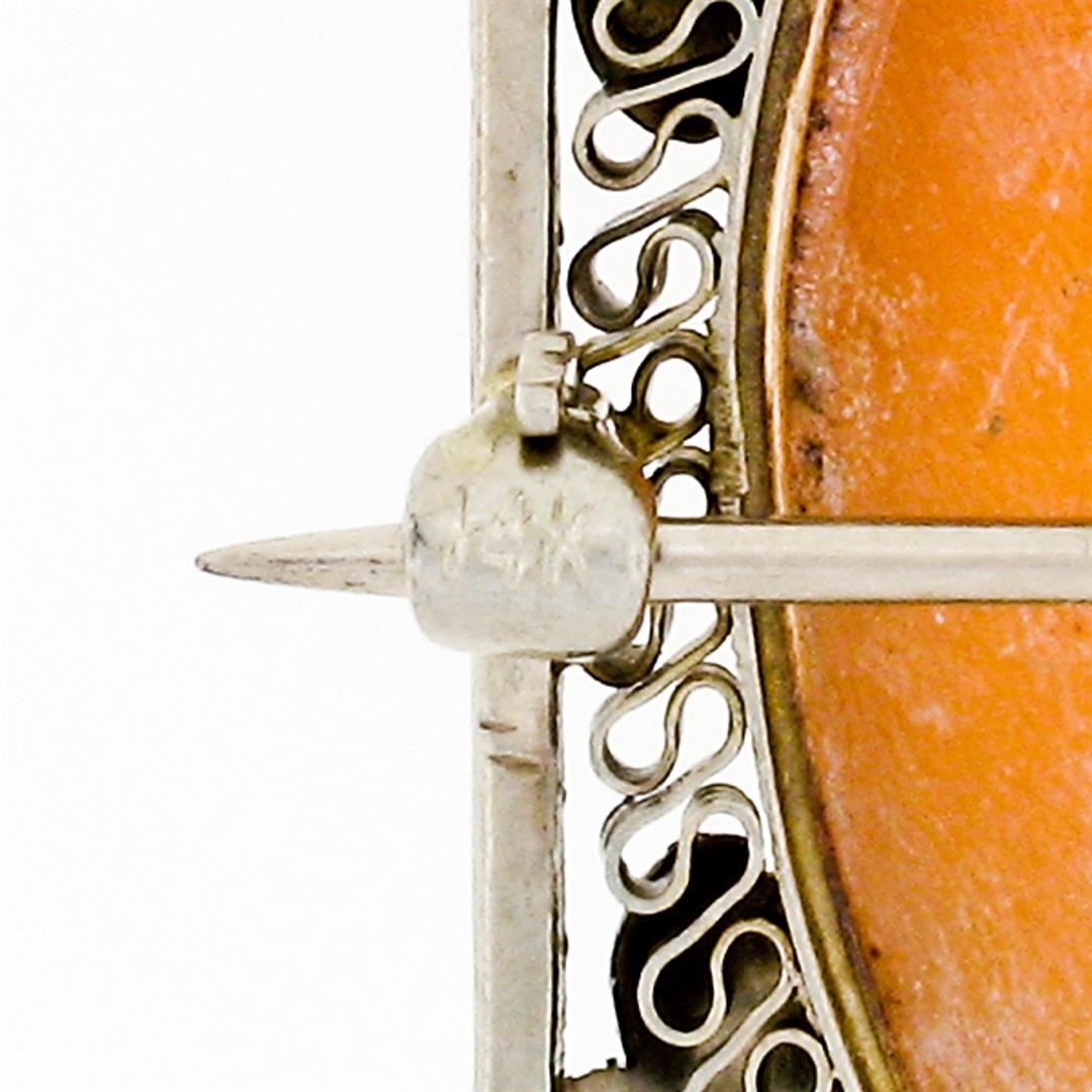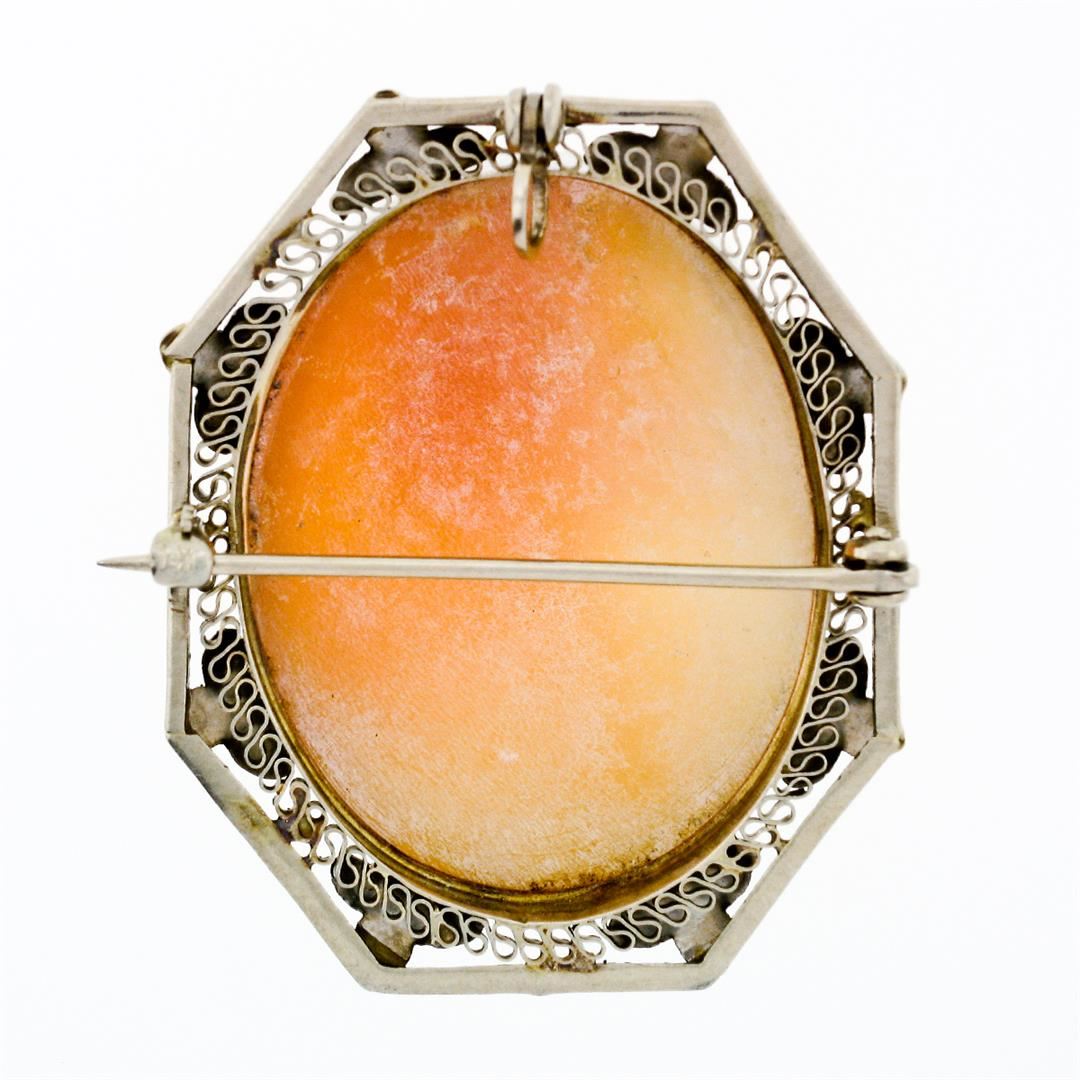 An antique solid 14k white gold brooch pendant, with 1 oval carved cameo shell (28.75x22.15mm). Measures 39.80x28.80mm and weighs a total of 8.1 grams.