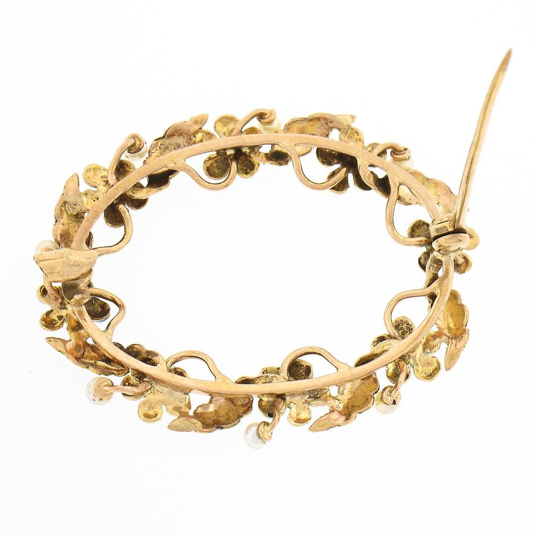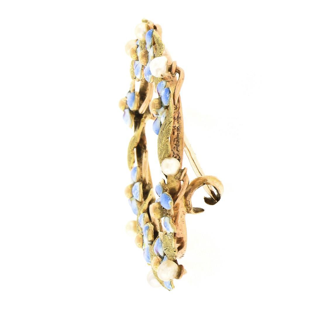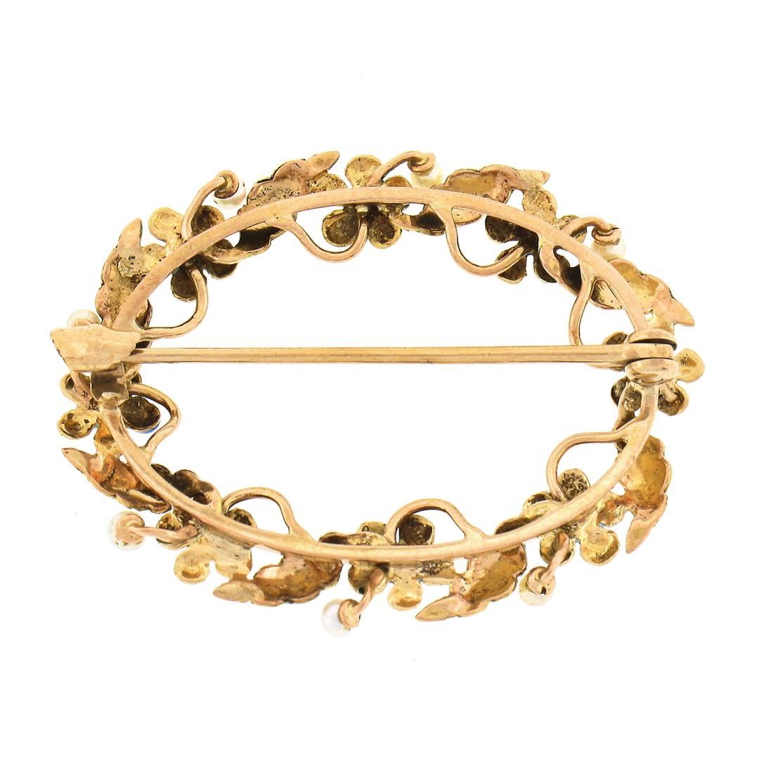 An antique solid 14k yellow gold and enamel wotk floral brooch, with 7 round shape cultured seed pearls (2.3mm each). Measures 29.40x37.10mm and weighs a total of 4.92 grams.
