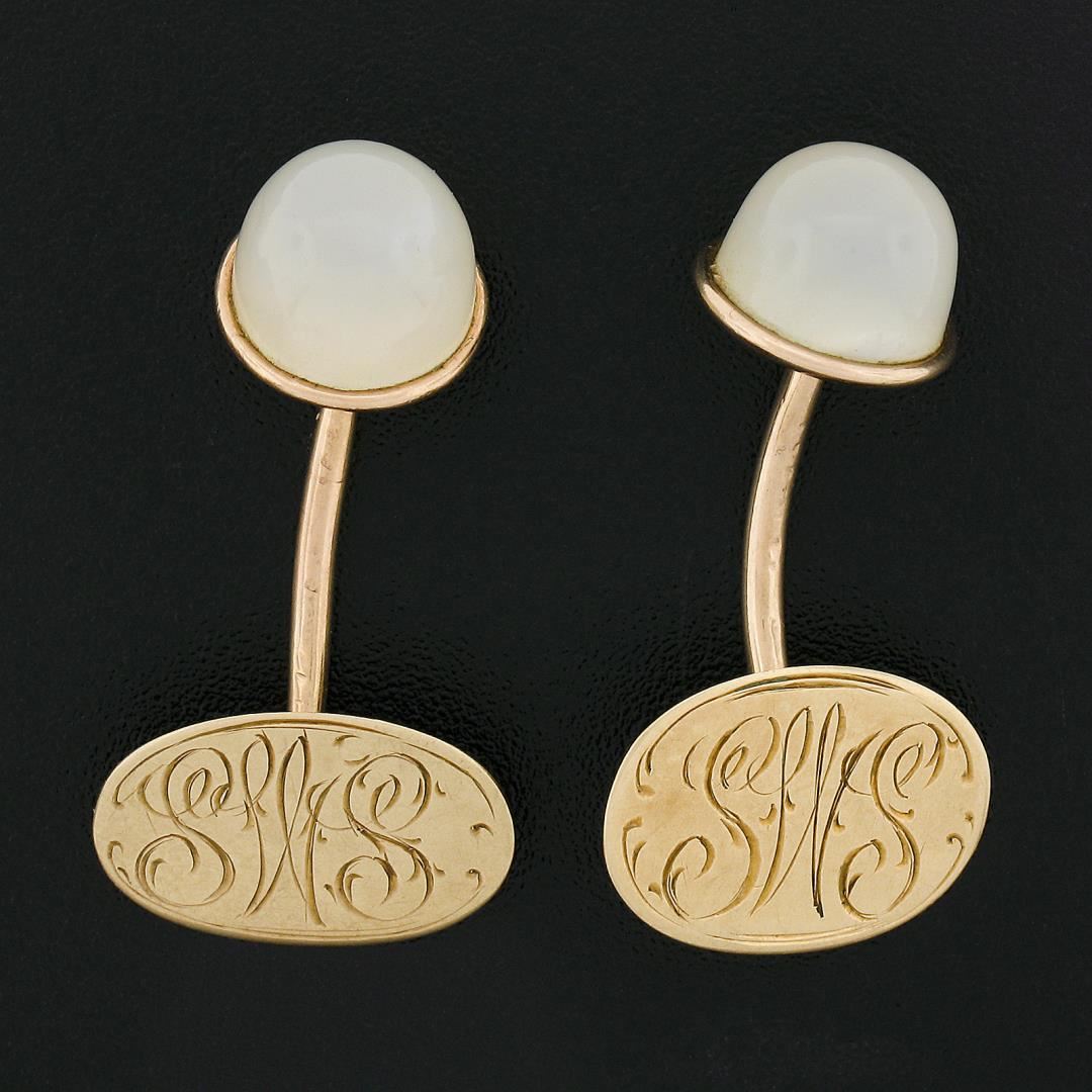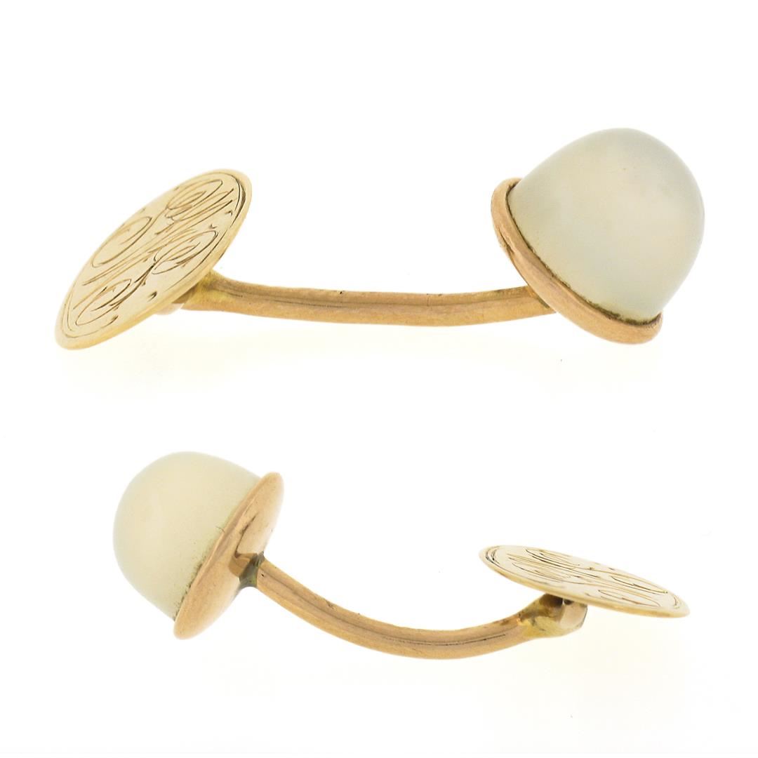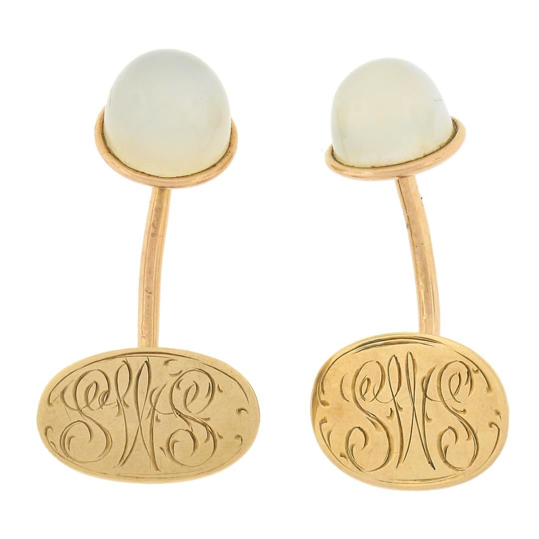 An antique solid 14k yellow gold cufflinks, with 2 round cabochon cut natural moonostones (9mm each). These cuff links have a bar design with a clearance of 16mm, weigh a total of 5.63 grams, and the front panels measure 10.2mm in diameter.