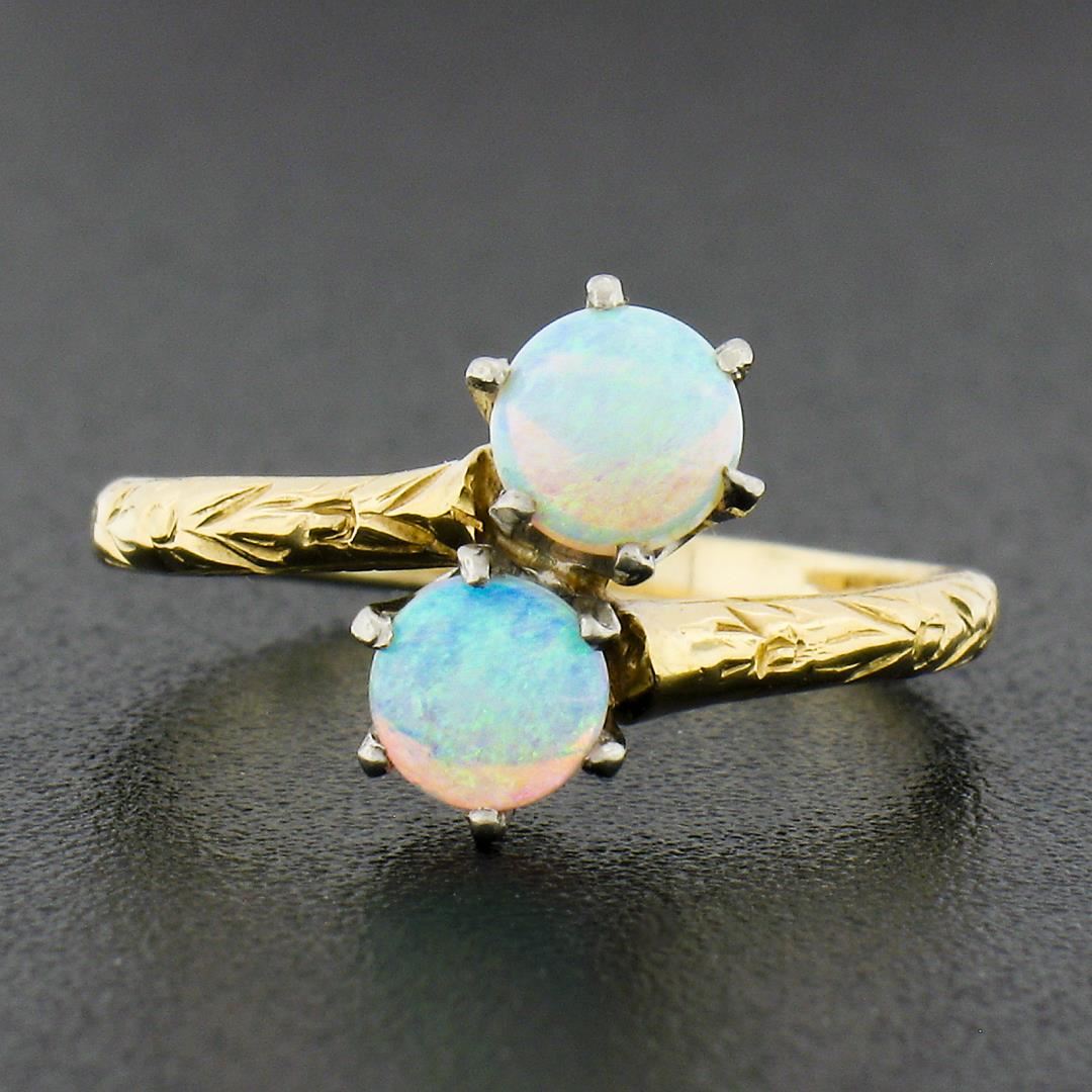 An antique solid 14k yellow gold bypass ring, with 2 round cabochon cut natural opals (4.3mm each). The ring is size 4.5, weighs a total of 1.65 grams, and measures 10.45mm wide.