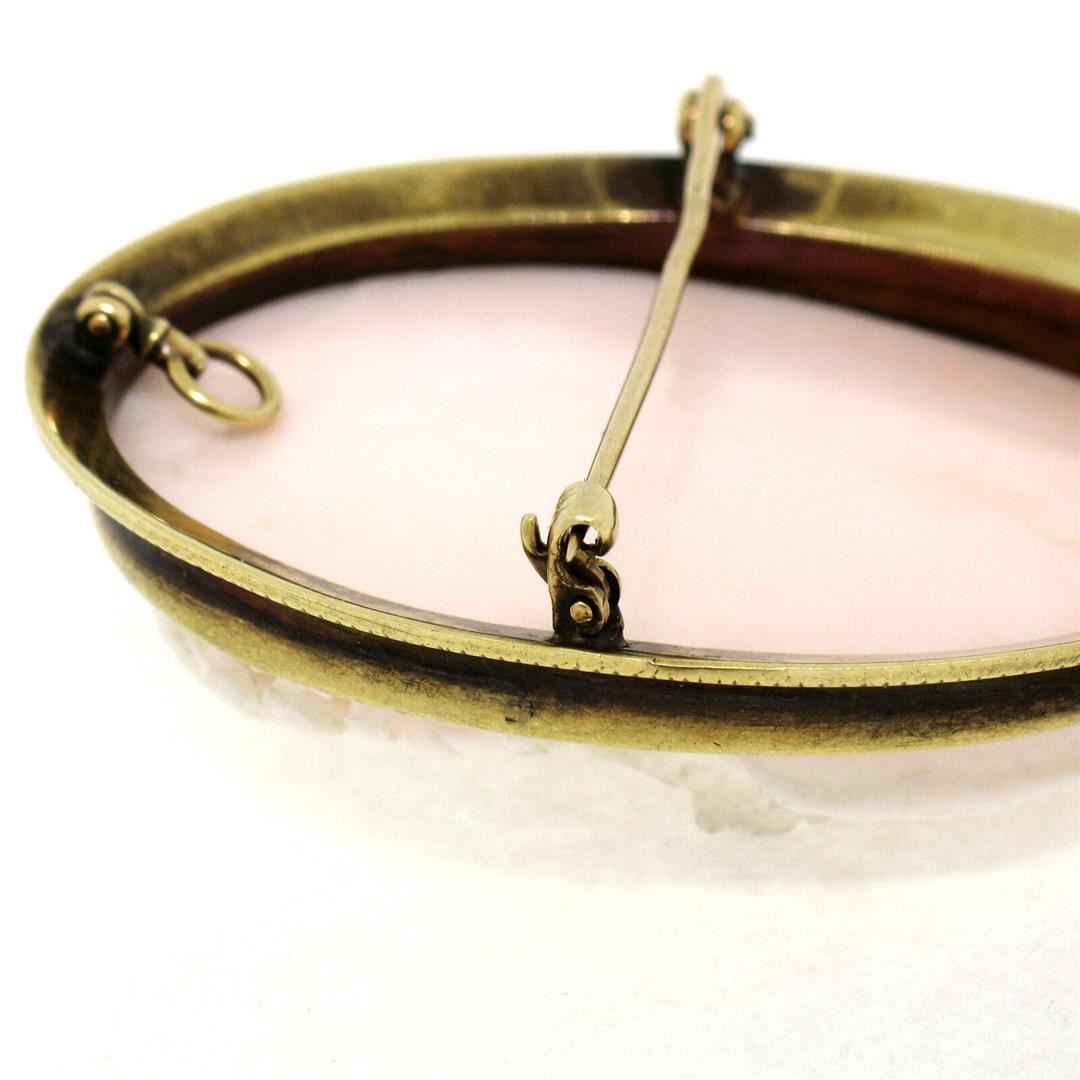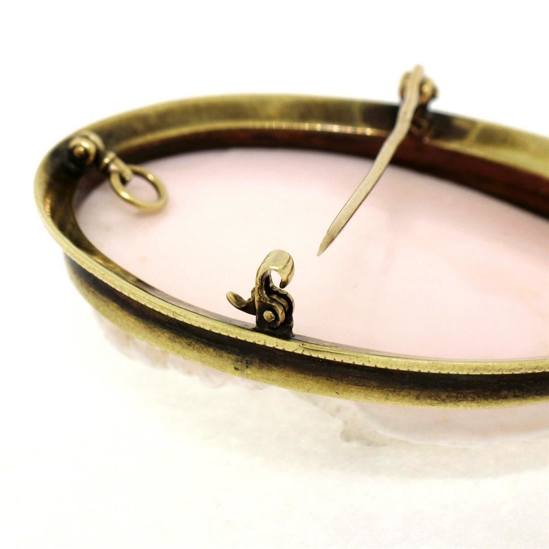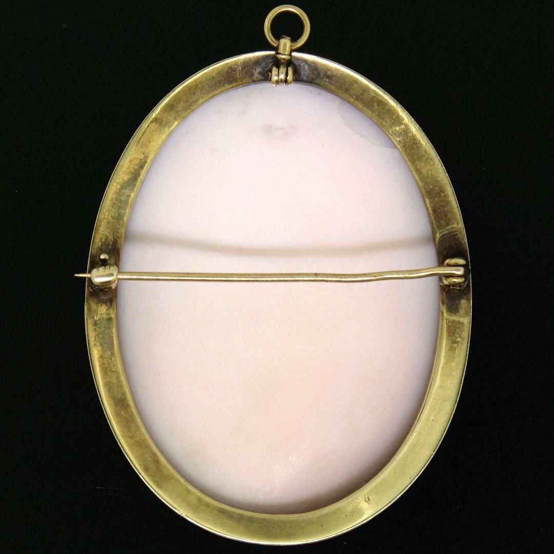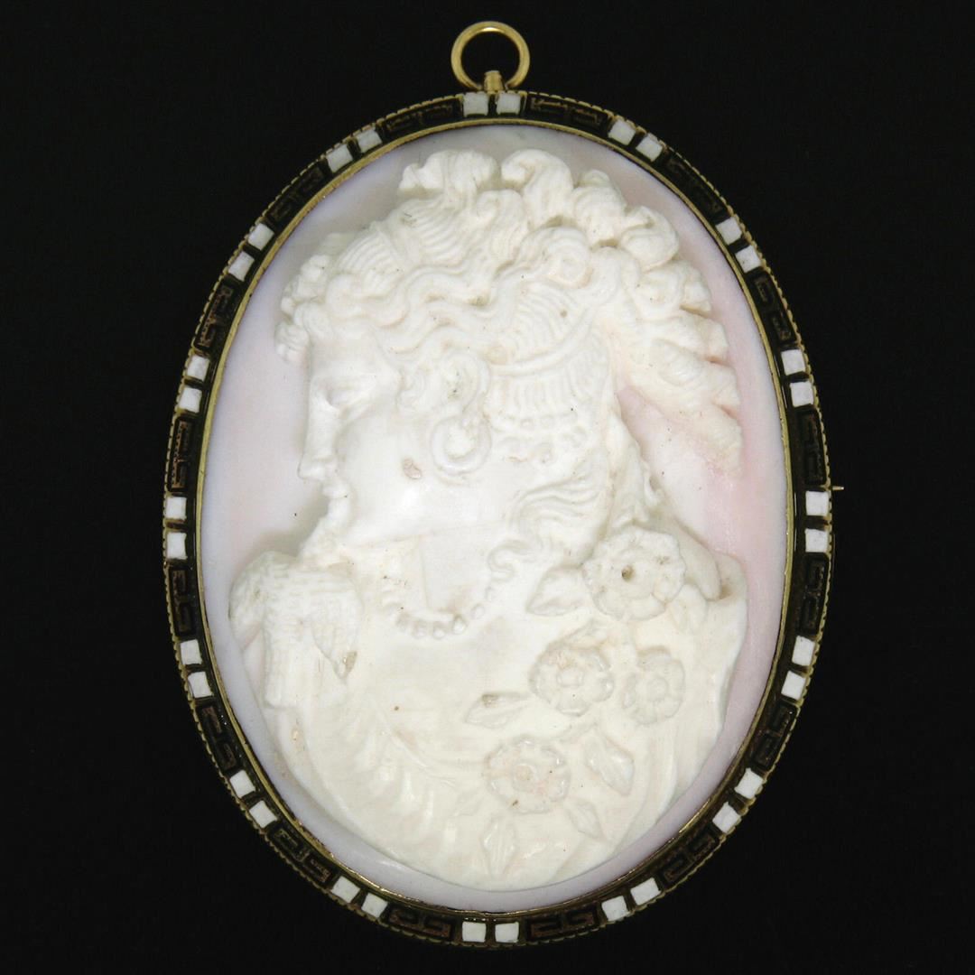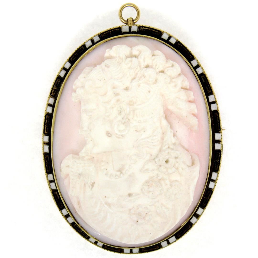 An antique solid 14k yellow gold and enamel large brooch or pendant, with 1 oval shape carved natural coral cameo (49.95x37mm). Measures 55.45x43.45mm and weighs a total of 40.37 grams.