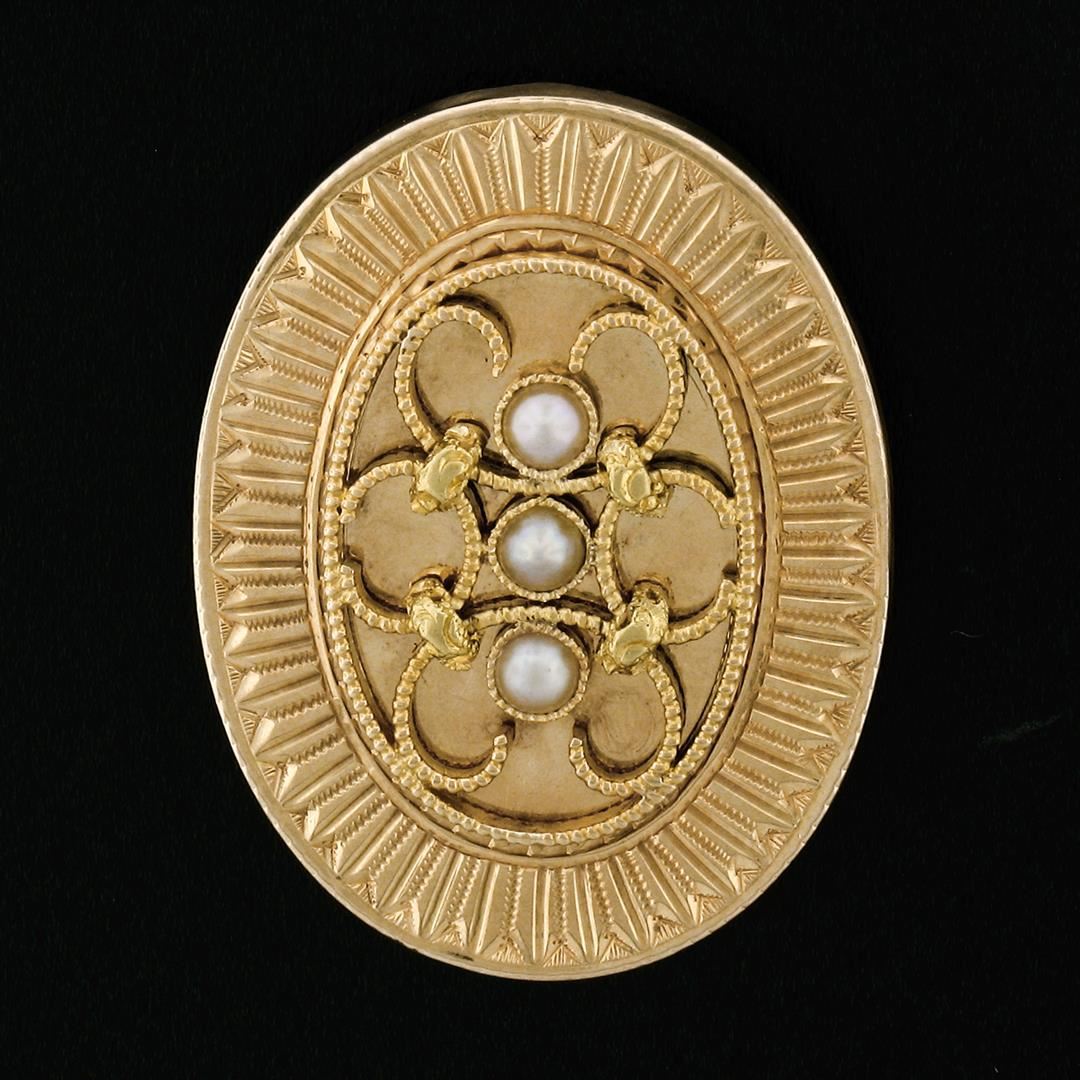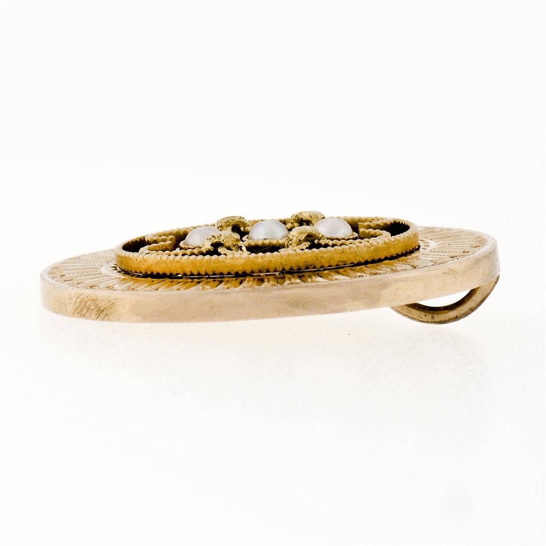 An antique solid 14k yellow gold pendant. with 3 round shape natural seed pearls (2.70mm). The pendant weighs a total of 4.65 grams, measures 27.60x21.30mm including the bail.