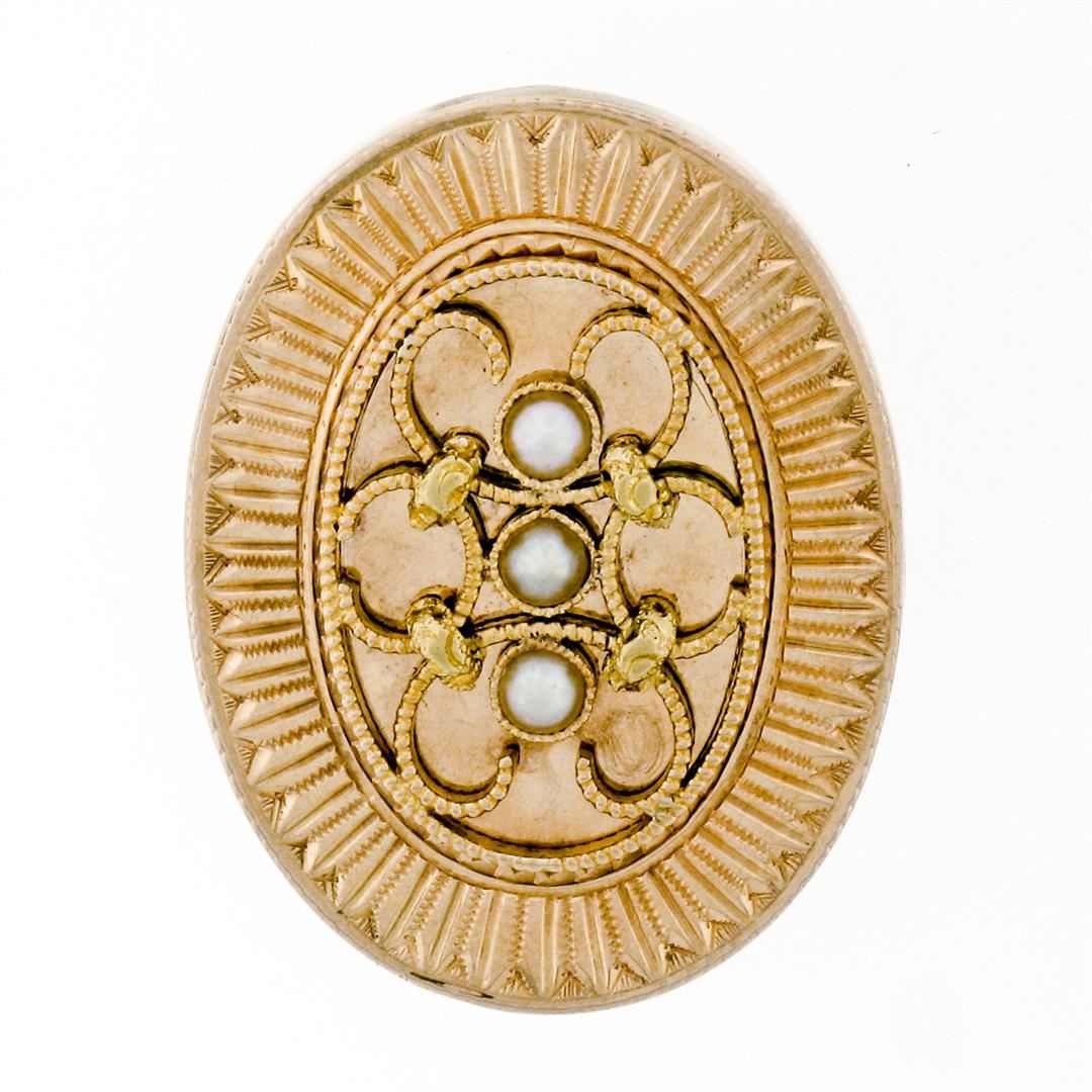 An antique solid 14k yellow gold pendant. with 3 round shape natural seed pearls (2.70mm). The pendant weighs a total of 4.65 grams, measures 27.60x21.30mm including the bail.