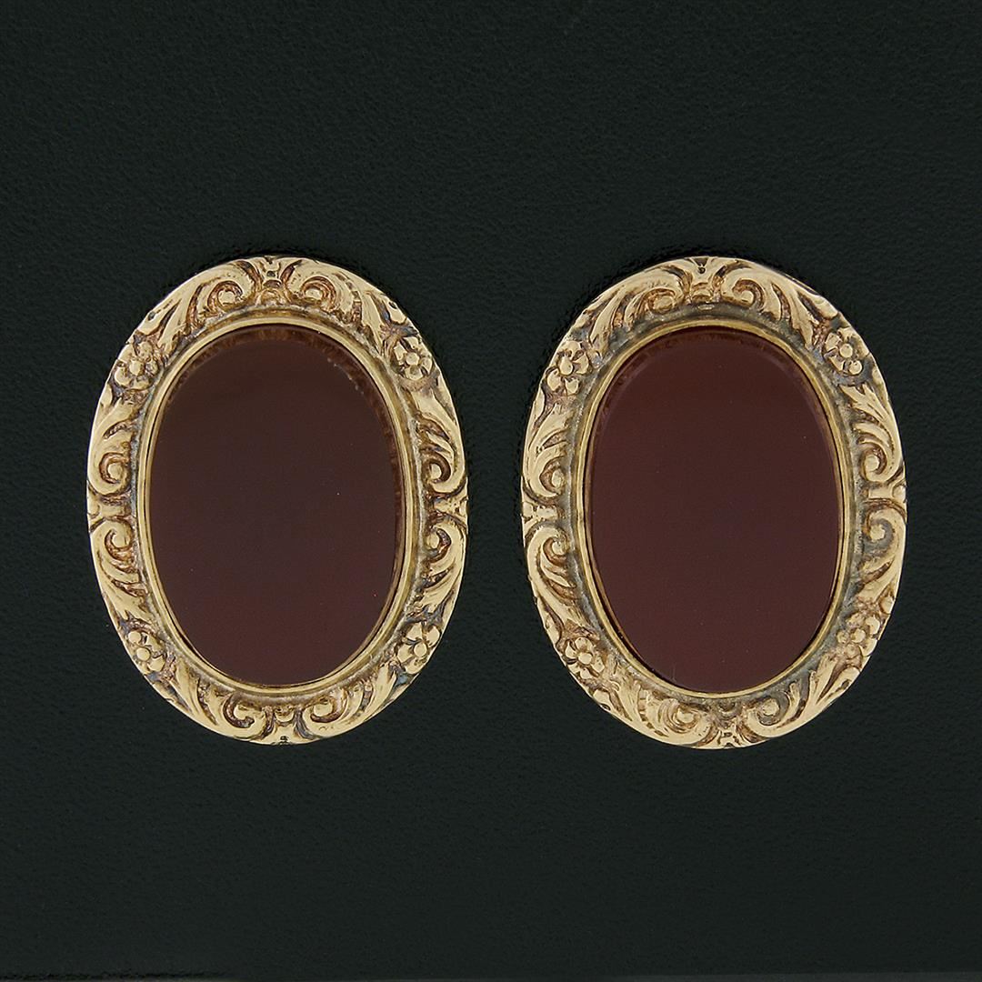 An antique solid 14k yellow gold pair of button earrings, featuring 2 oval cut natural carnelians (10.80x15.50mm each). The earrings measure approximately 21.20x16.30mm and weigh a total of 7.68 grams.