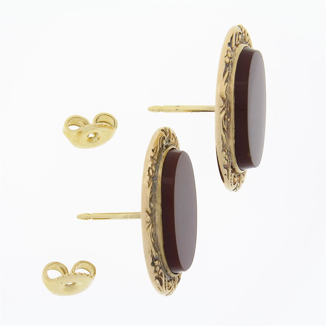 An antique solid 14k yellow gold pair of button earrings, featuring 2 oval cut natural carnelians (10.80x15.50mm each). The earrings measure approximately 21.20x16.30mm and weigh a total of 7.68 grams.