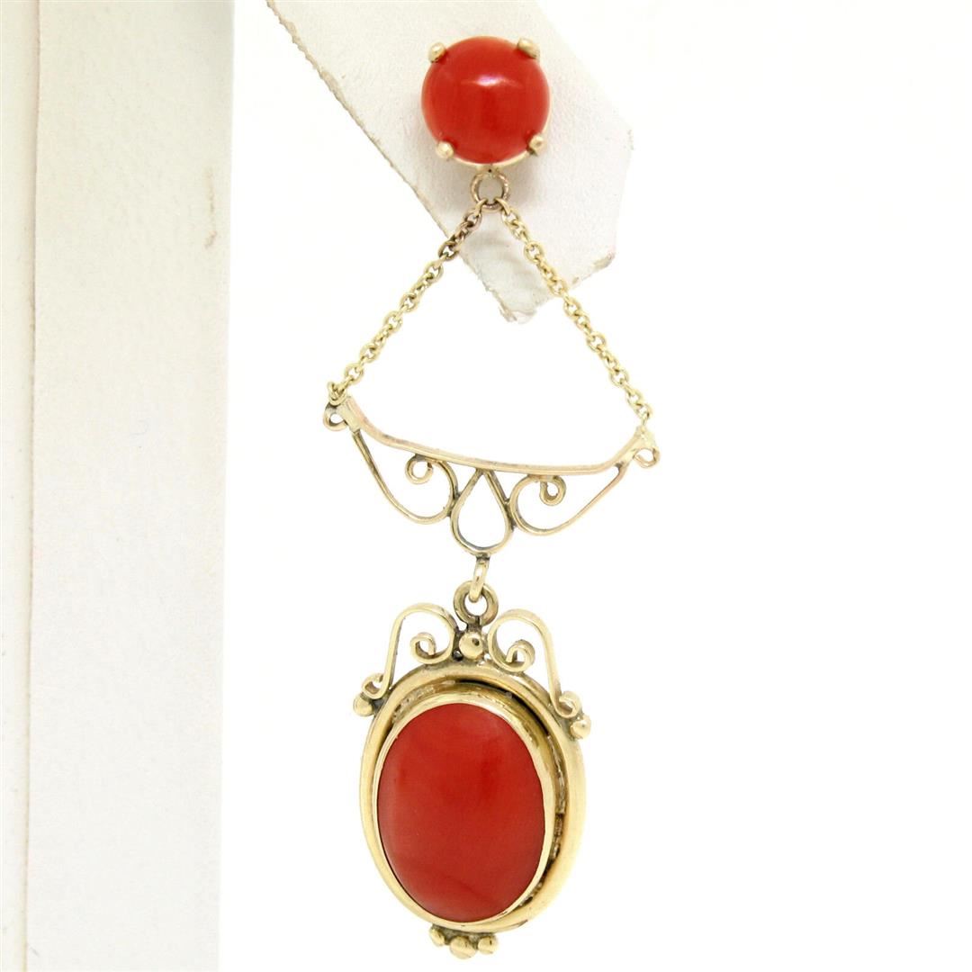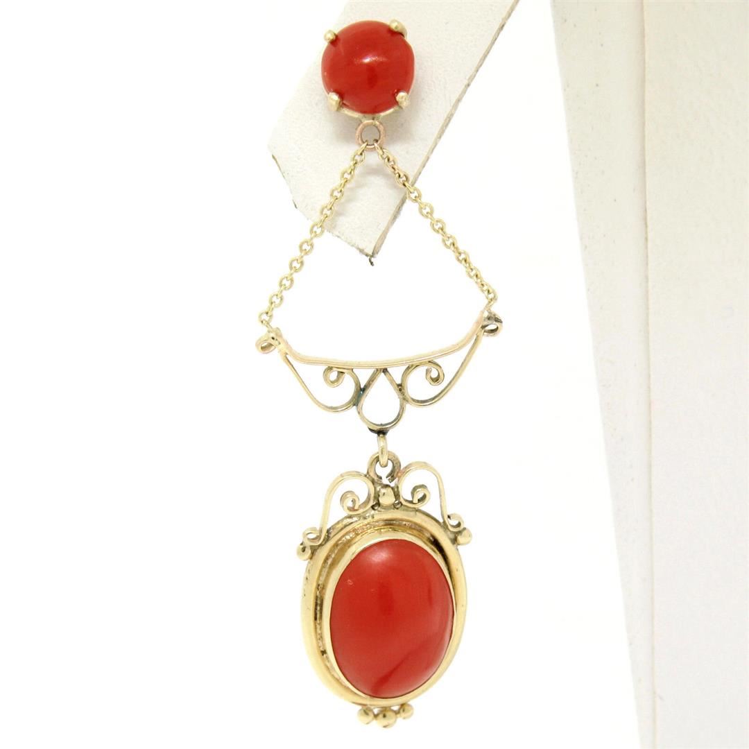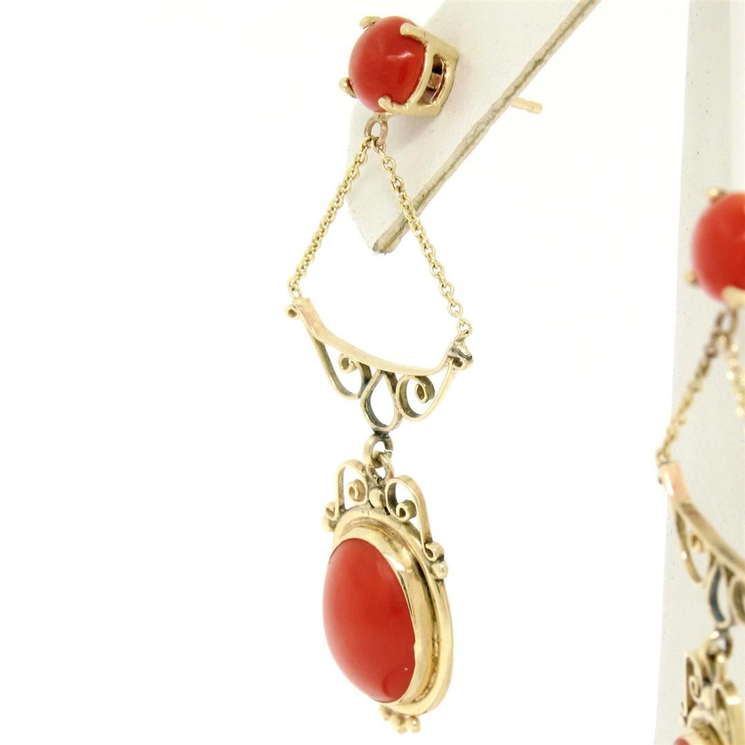 An antique solid 14k yellow gold dangel drop earrings, with 2 oval cabochon cut natural coral (11.30x8.30mm), and 2 round cabochon cut natural coral (5.90-6.00mm).The earrings measure approximately 47.50x16mm and weigh a total of 4.57 grams.