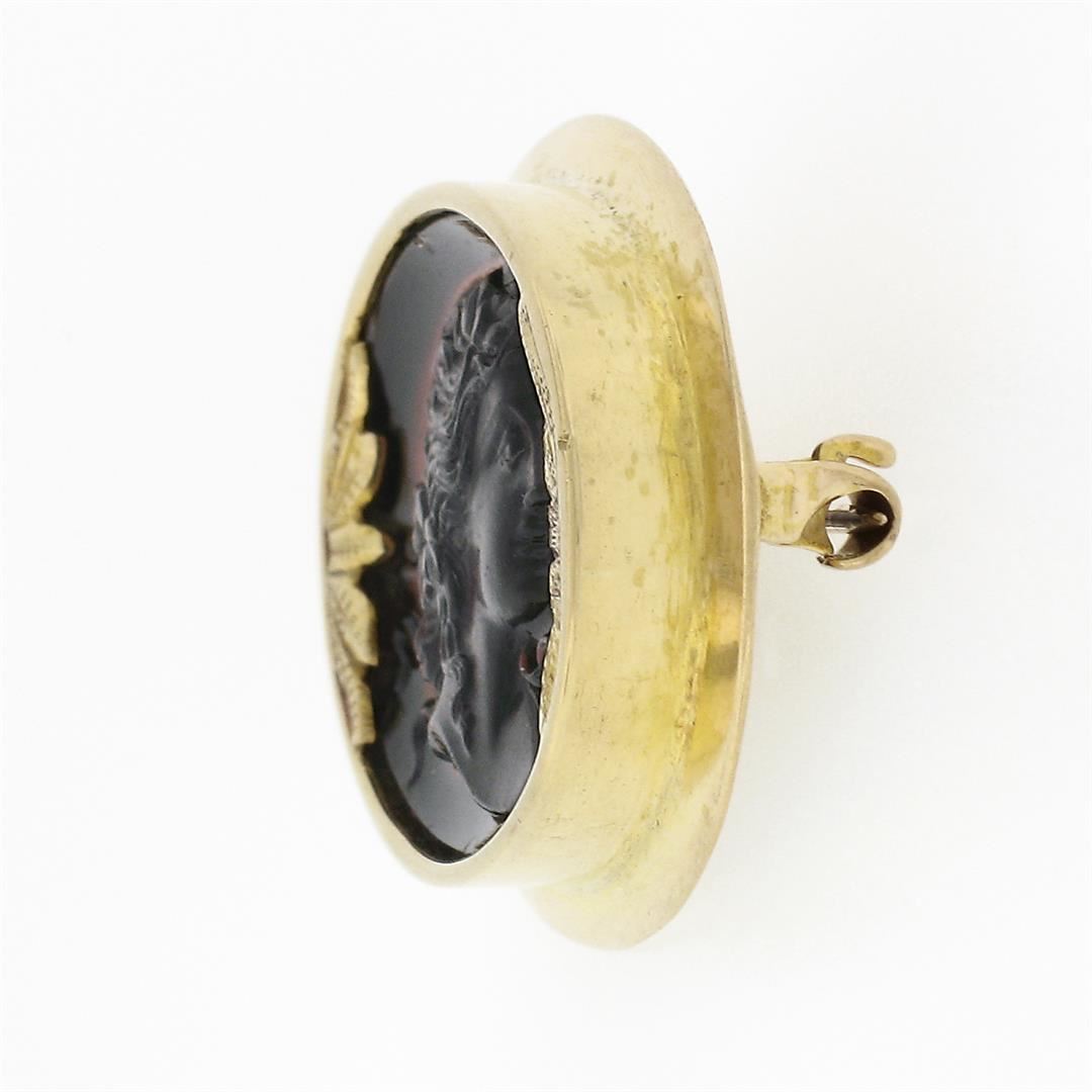 An antique solid 14k yellow gold cameo carved glass pin brooch, with 1 Measures 22.6x29.3mm and weighs a total of 5.61 grams.