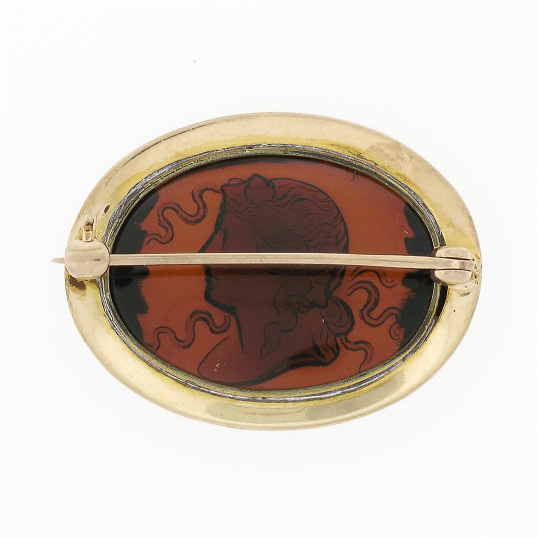An antique solid 14k yellow gold cameo carved glass pin brooch, with 1 Measures 22.6x29.3mm and weighs a total of 5.61 grams.