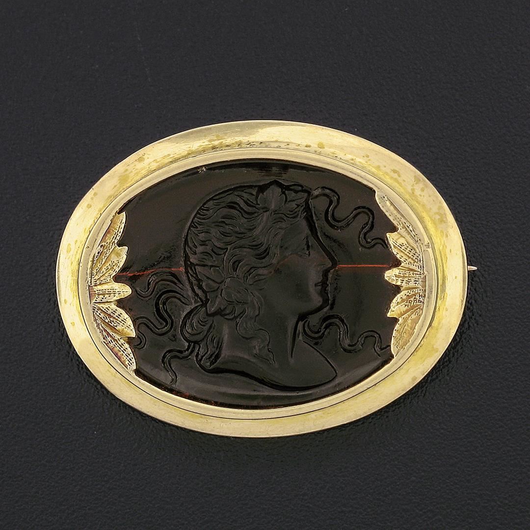 An antique solid 14k yellow gold cameo carved glass pin brooch, with 1 Measures 22.6x29.3mm and weighs a total of 5.61 grams.