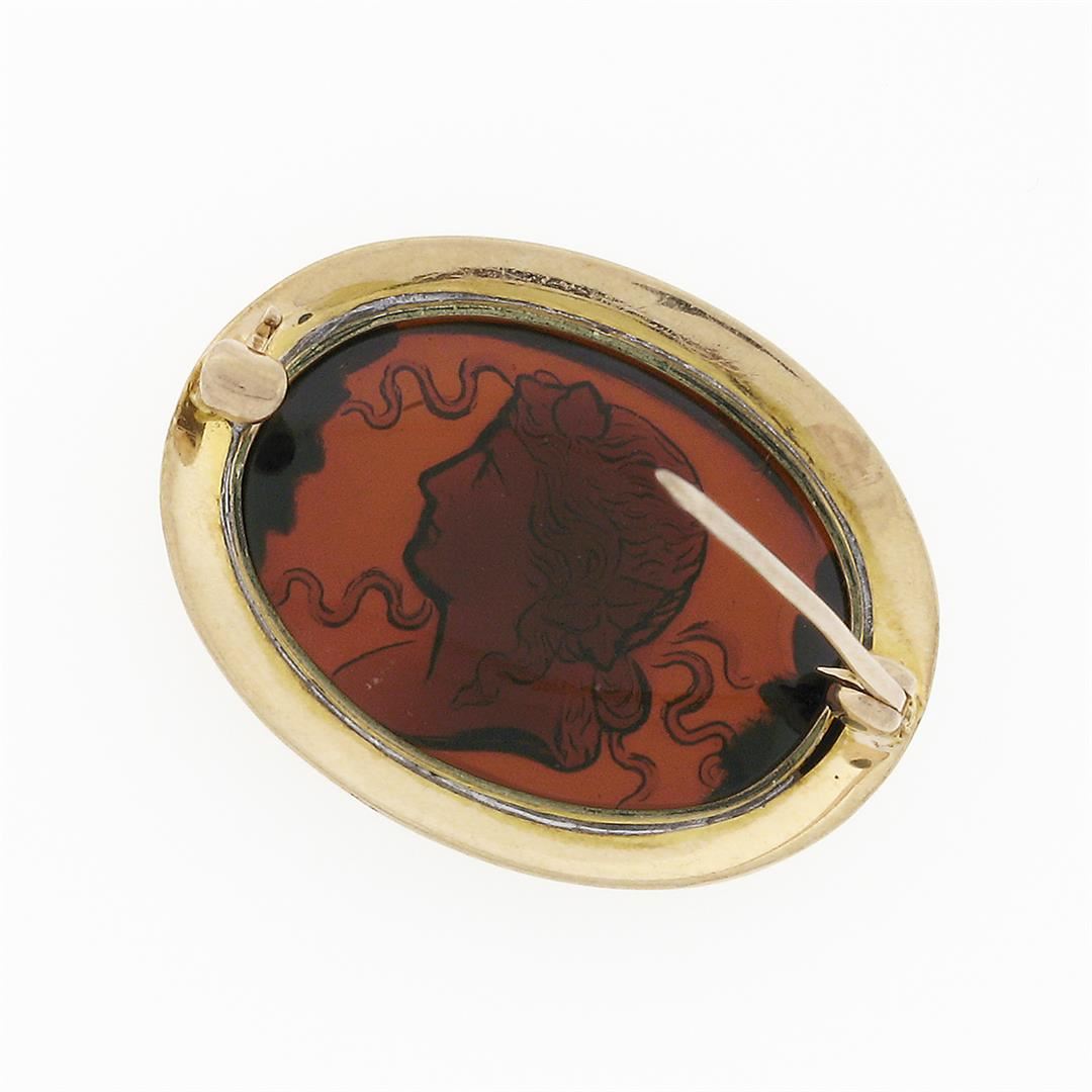 An antique solid 14k yellow gold cameo carved glass pin brooch, with 1 Measures 22.6x29.3mm and weighs a total of 5.61 grams.