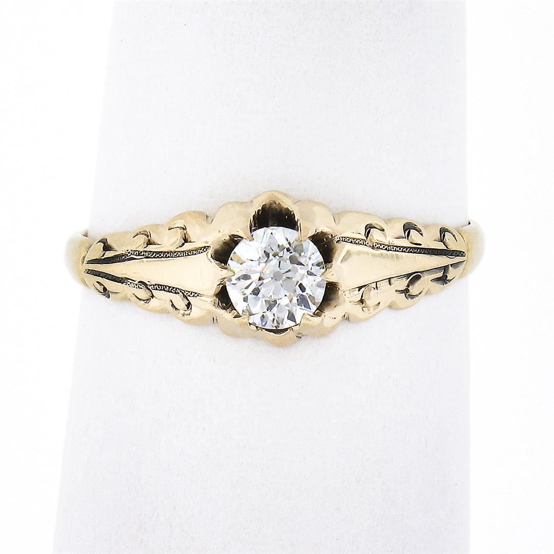 An antique solid 14k yellow gold engagement ring, with 1 old european cut natural diamond (G - SI1 ; 0.30ct). The ring is size 5.5, weighs a total of 1.23 grams, and measures 6.30mm wide.
