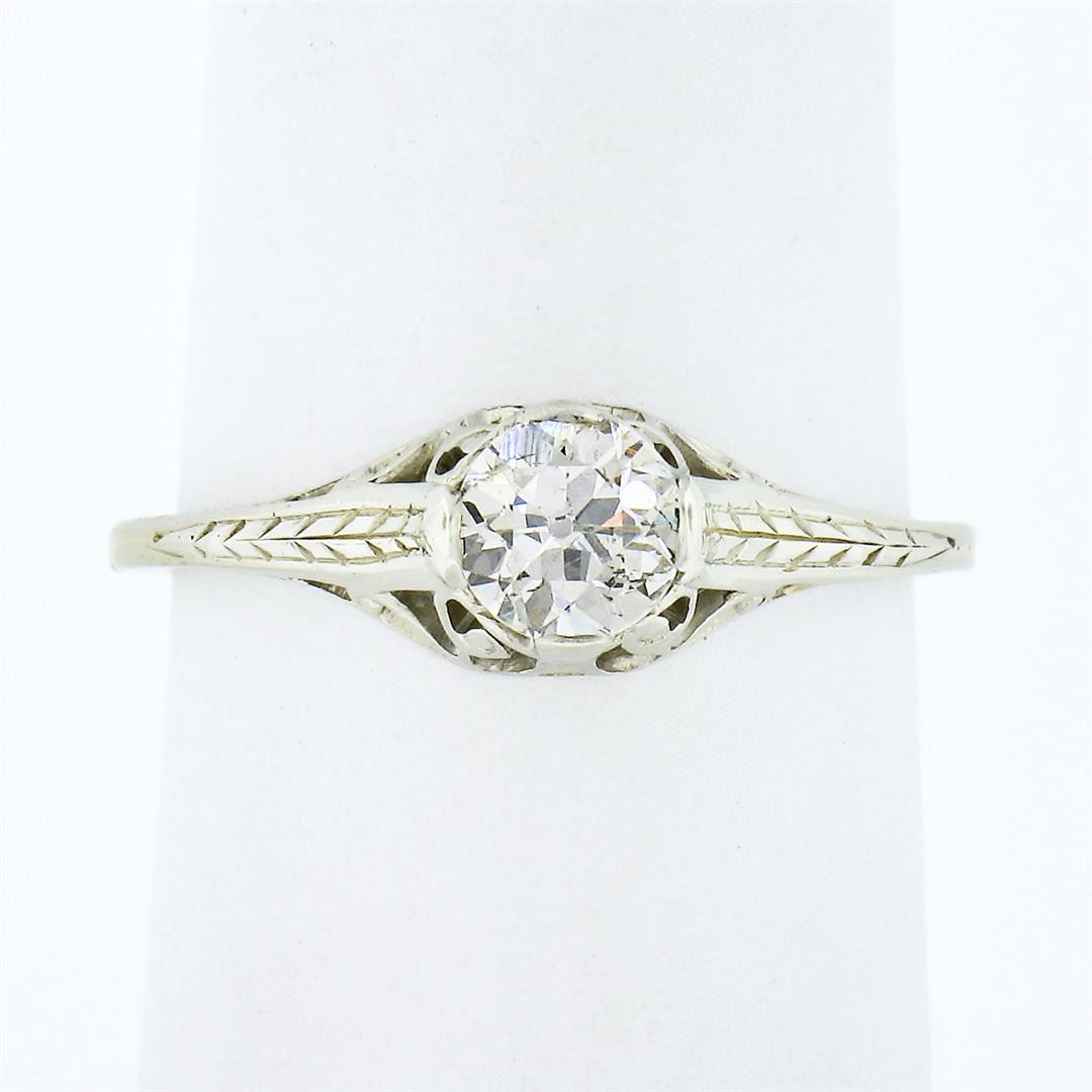 An antique solid 14k white gold engagement ring, with 1 Gia certified old European cut natural diamond (I - I1; 0.54ct). The ring is size 6.75, weighs a total of 1.57 grams, and measures 6.1mm wide. Comes with all original relevant certifications.