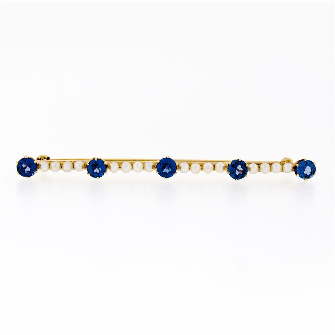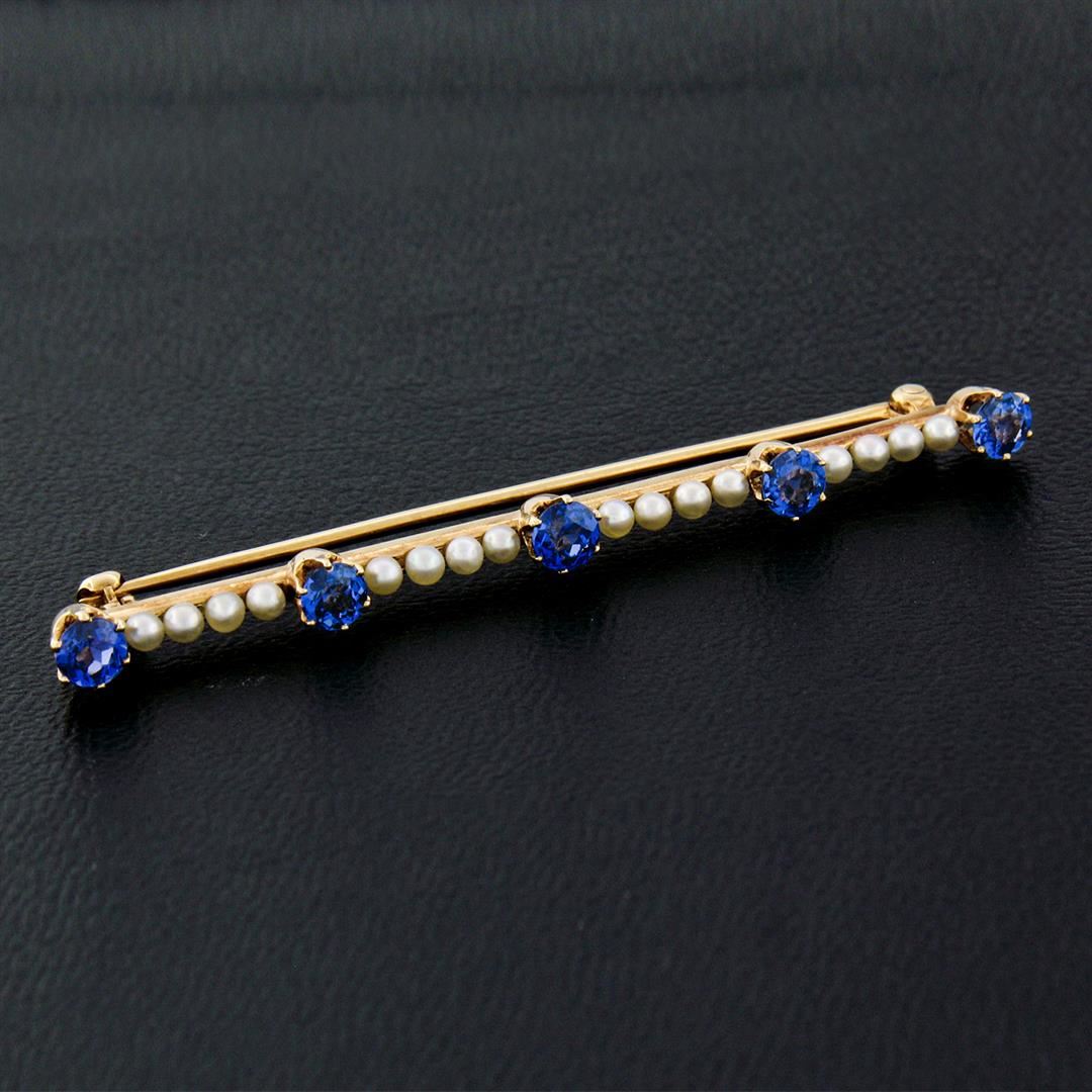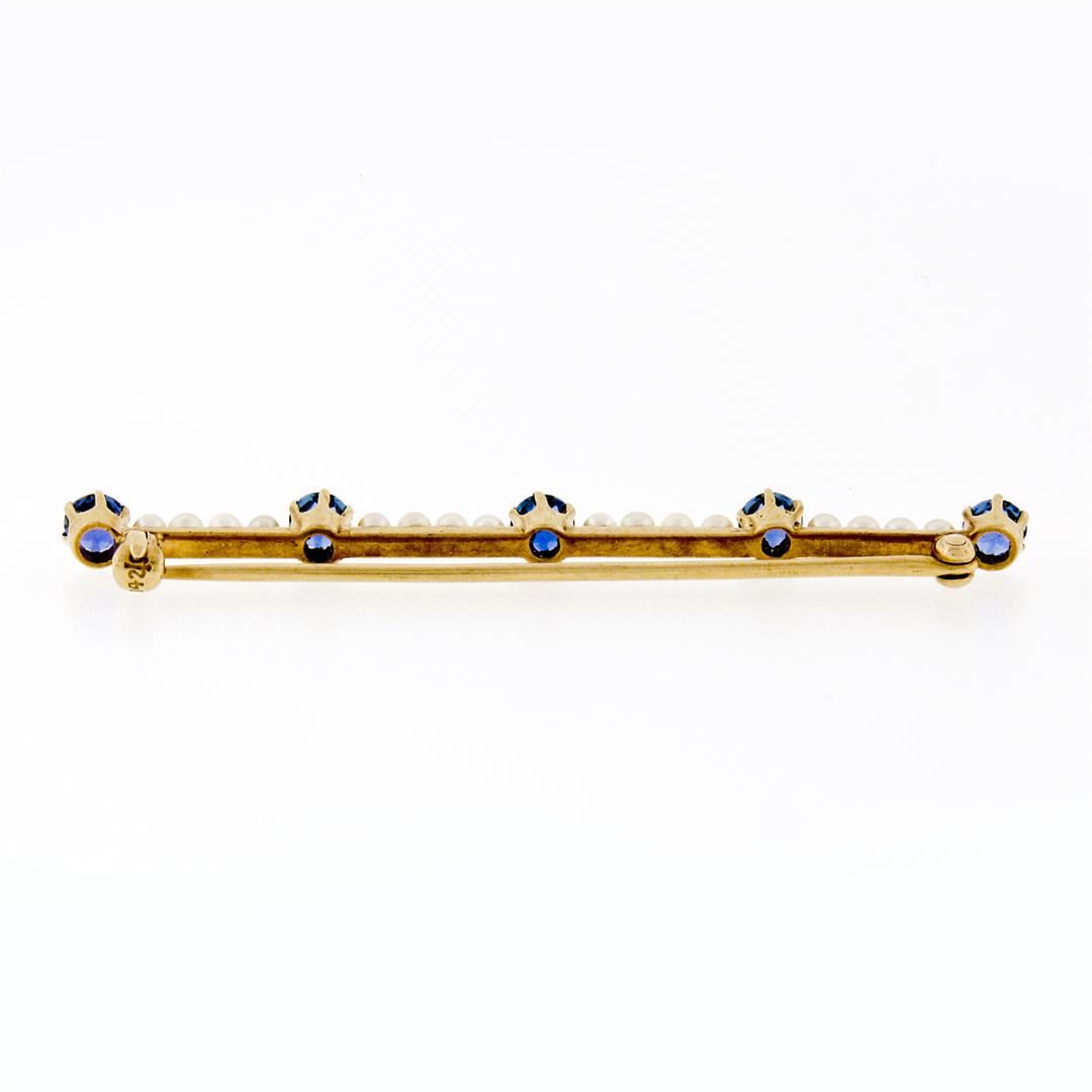 An antique solide 14k yellow gold bar pin brooch, featuring 5 old round cut natural sapphires (1.50ctw), and 16 round shape natural seed pearls (2.0mm). Measures 56.15x4.30mm and weighs a total of 3.42 grams.