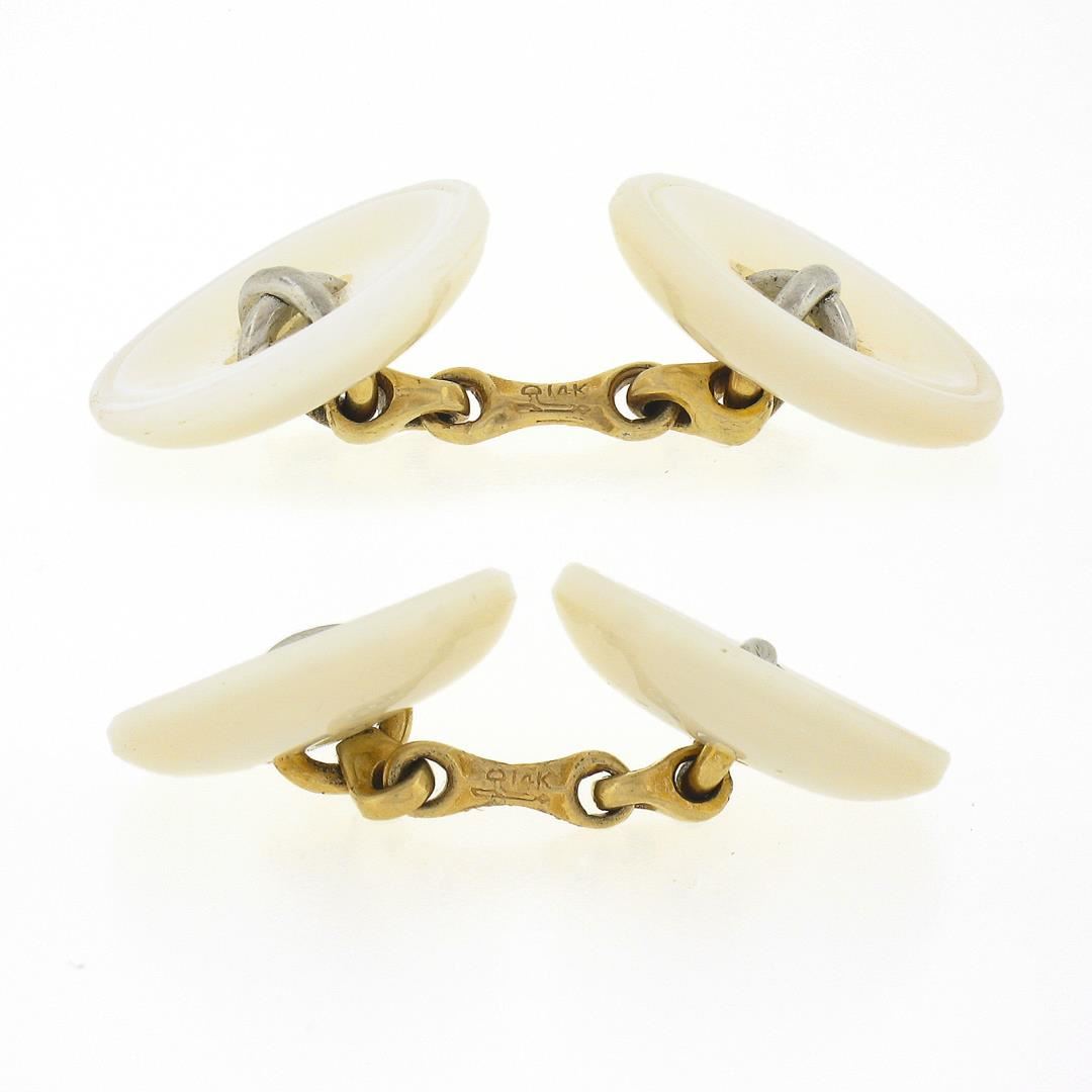 An antique solid 14k yellow gold button cufflinks, with 4 round shape cultured mother of pearls (14.6mm each). These cuff links have a linking bar design with a clearance of 16.1mm, weigh a total of 6.21 grams, and the front panels measure 14.6mm in diameter.