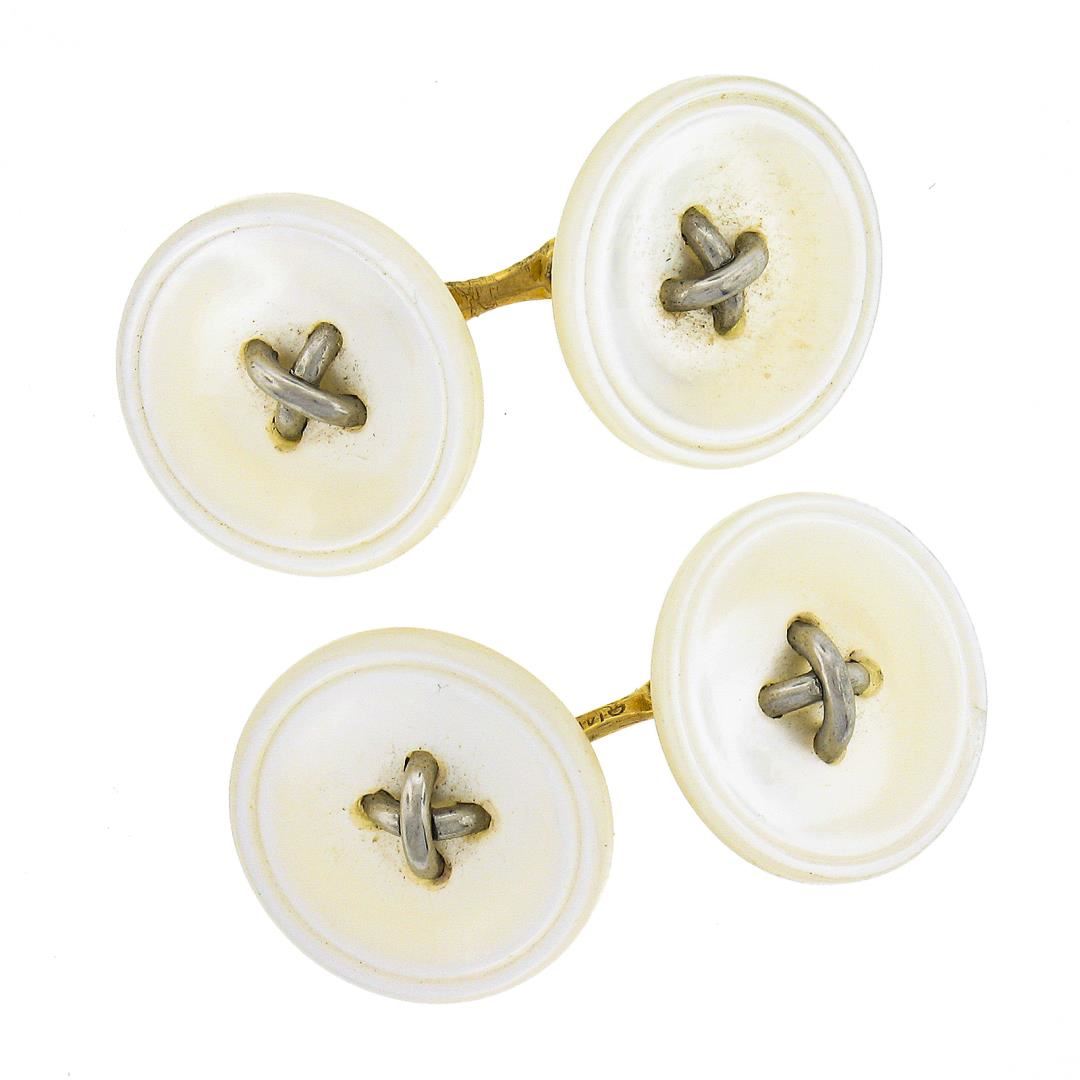 An antique solid 14k yellow gold button cufflinks, with 4 round shape cultured mother of pearls (14.6mm each). These cuff links have a linking bar design with a clearance of 16.1mm, weigh a total of 6.21 grams, and the front panels measure 14.6mm in diameter.