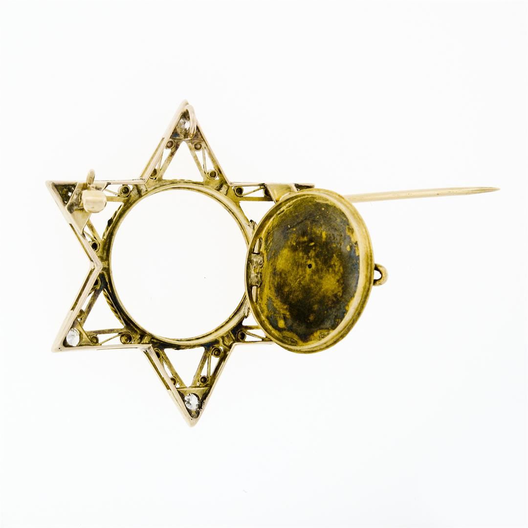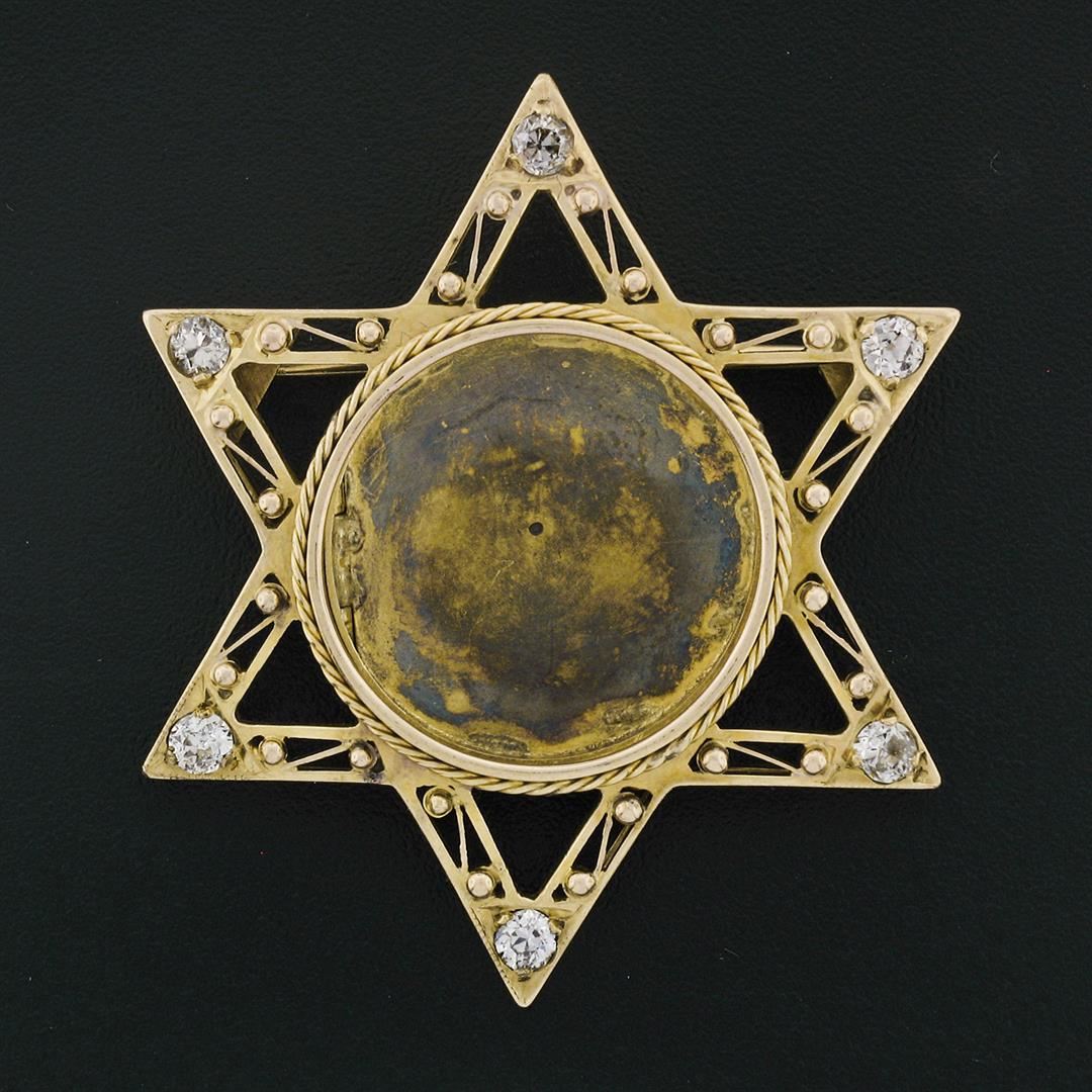 Antique 14k Gold .50ctw European Diamond Star of David Pin Brooch Locket Pendant. An antique solid 14k yellow gold locket brooch or pendant featuring a Star of David design with 6 old European cut natural diamonds (G/H - VS1/VS2; 0.50ctw), one at each of