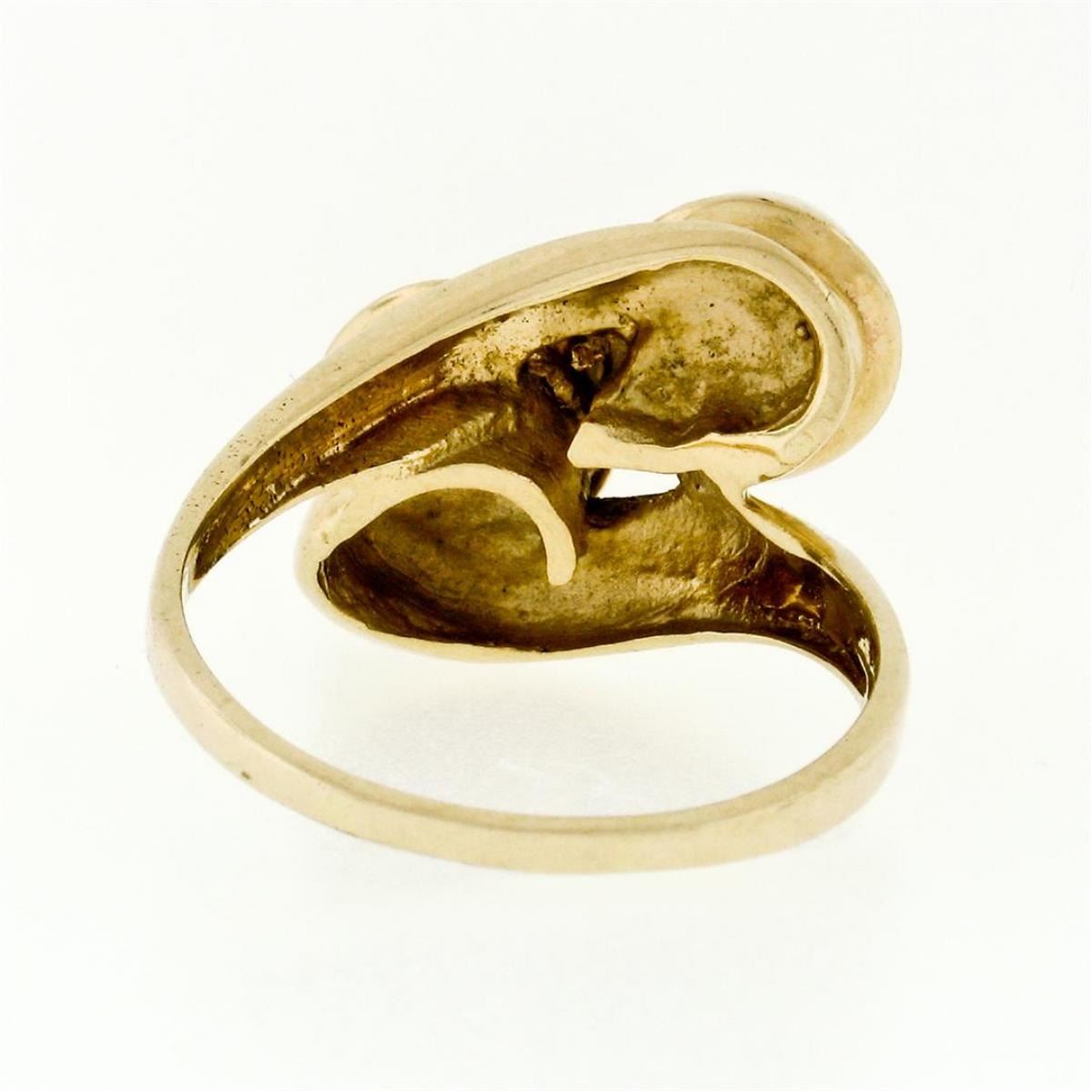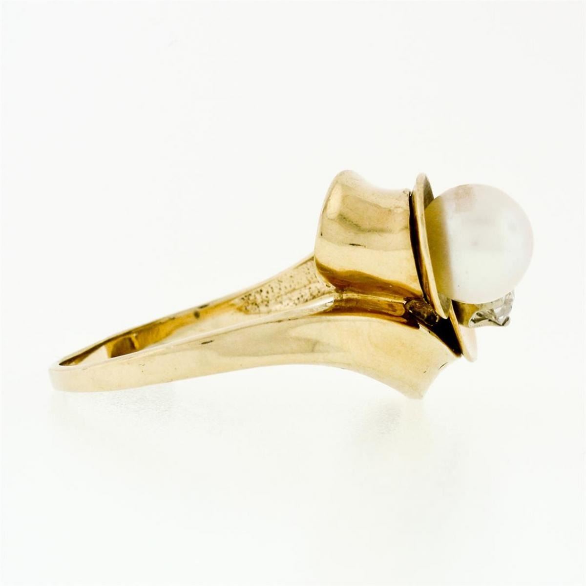An antique solid 14k yellow gold bypass cocktail ring with 1 cultured pearl (7.2mm) and 1 natural diamond (G - SI1; 0.58ctw). The ring is size 8.5, weighs a total of 6.02 grams, and measures 15mm wide.