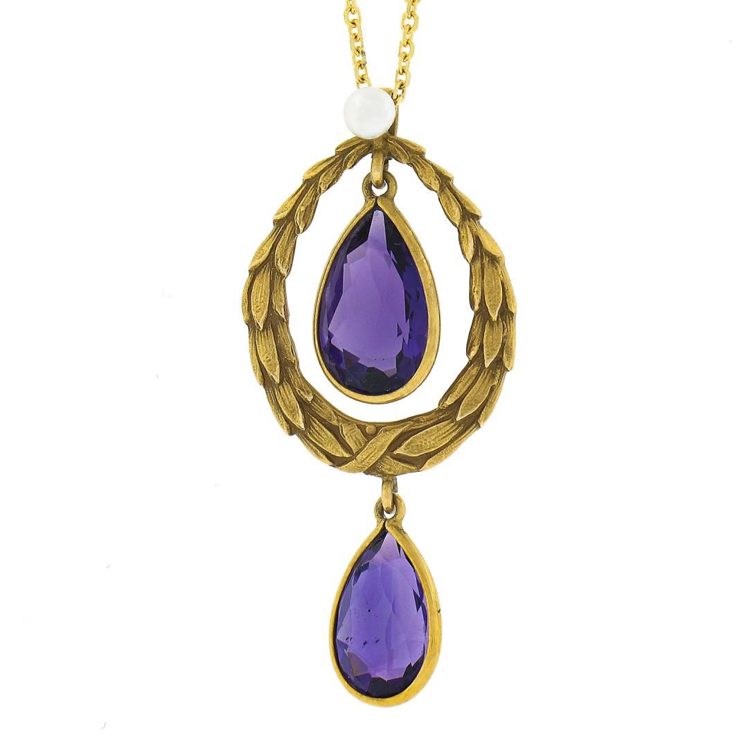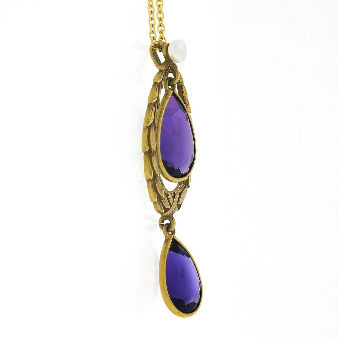An antique solid 14k yellow gold dangle lavalier pendant necklace, with 1 bead shape cultured pearl (3mm), and 2 faceted pear cut natural amethysts (10.8x7.4mm & 9.6x6.7mm). Adjustable 16 or 18 inch cable link chain, 4.31 grams total weight, pendant measures 35.2x16mm.
