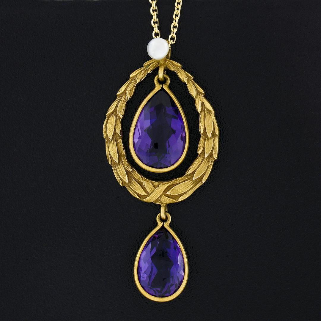 An antique solid 14k yellow gold dangle lavalier pendant necklace, with 1 bead shape cultured pearl (3mm), and 2 faceted pear cut natural amethysts (10.8x7.4mm & 9.6x6.7mm). Adjustable 16 or 18 inch cable link chain, 4.31 grams total weight, pendant measures 35.2x16mm.