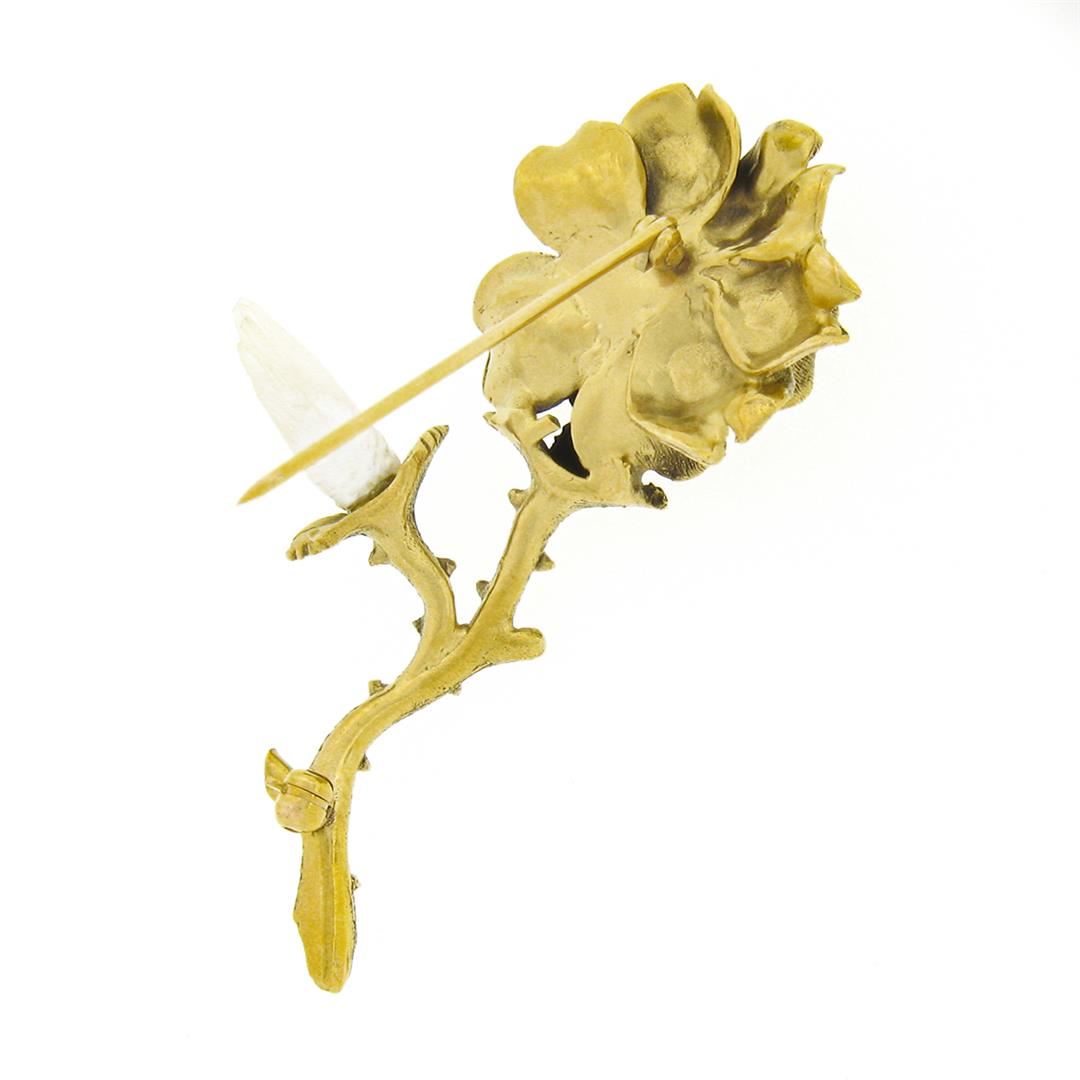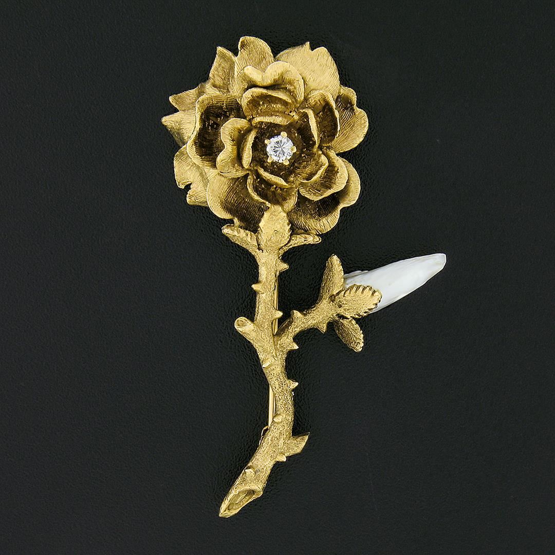 An antique solid 14k yellow gold rose flower pin brooch, with 1 swiss cut natural diamond (G - VS2 ; 0.10ctw), and 1 baroque shape cultured river pearl (13.6x5.5mm). Measures 53.90x31.90mm and weighs a total of 12.10 grams.