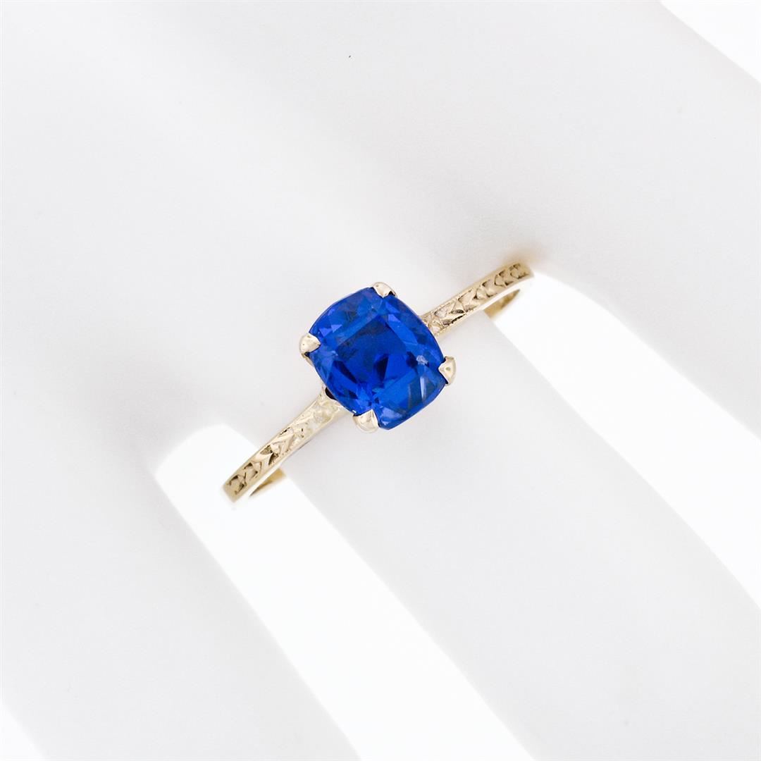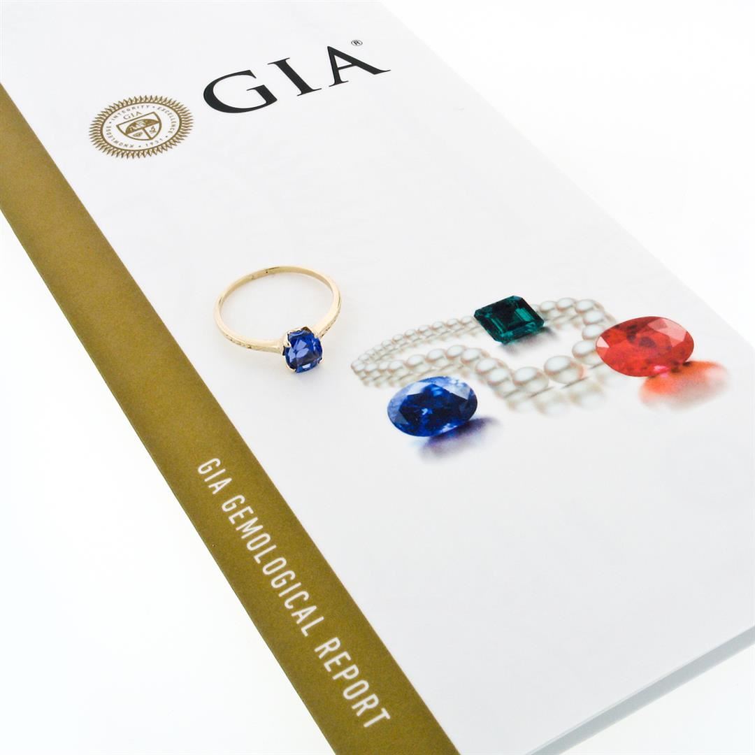 An antique victorian solid 14k yellow gold solitaire ring, with 1 Gia certified cushion cut natural sapphire (1.95ct). The ring is size 8, weighs a total of 1.80 grams, and measures 7.11mm wide. Comes with all original relevant certifications.