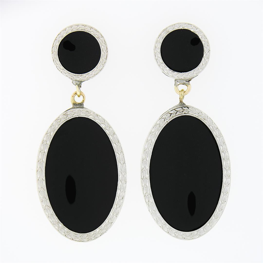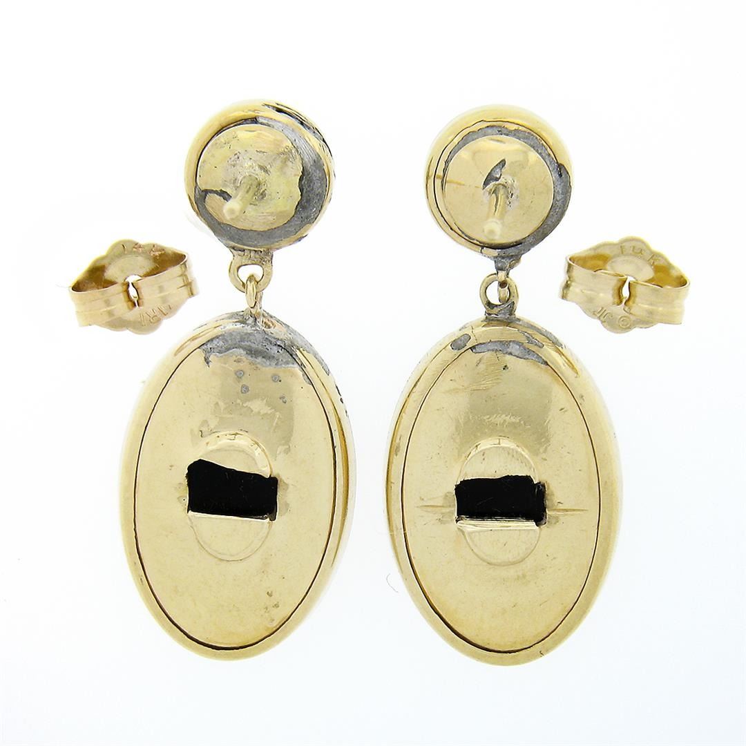 An antique art deco solid 14k yellow gold & platinum dangle earrings, with 2 round cabochon cut natural black onyx (5.2mm), & 2 oval cabochon cut natural balck onyx (14.35x9.0mm). The earrings measure approximately 27.2x11.35mm and weigh a total of 3.95 grams.