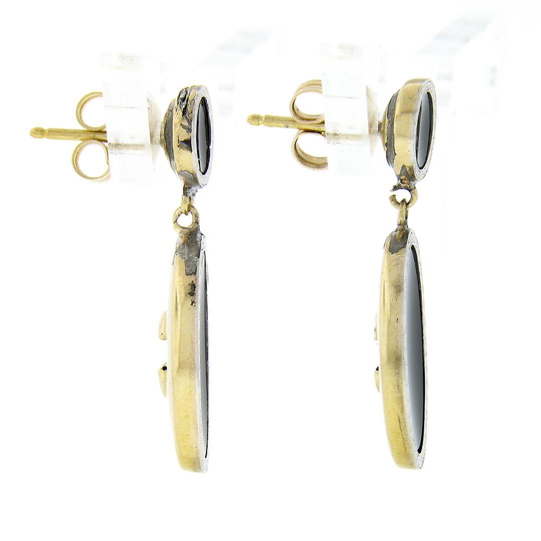 An antique art deco solid 14k yellow gold & platinum dangle earrings, with 2 round cabochon cut natural black onyx (5.2mm), & 2 oval cabochon cut natural balck onyx (14.35x9.0mm). The earrings measure approximately 27.2x11.35mm and weigh a total of 3.95 grams.