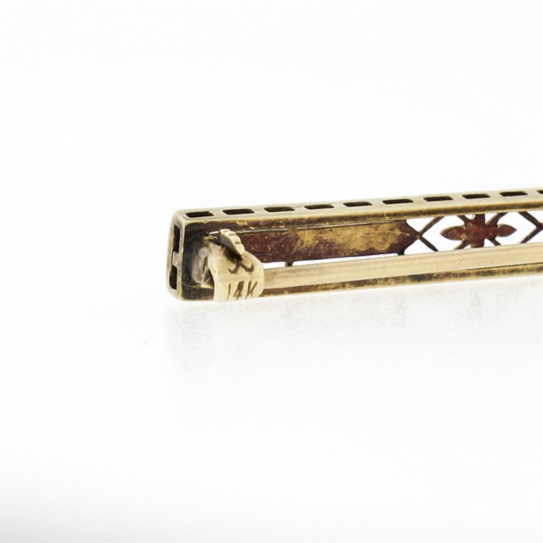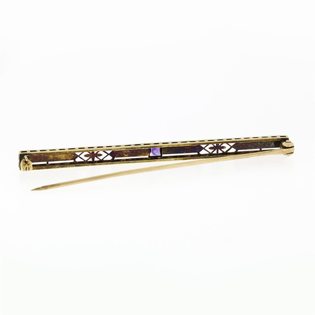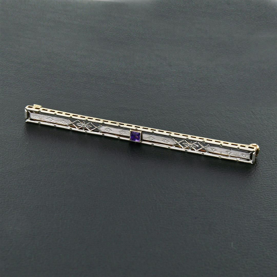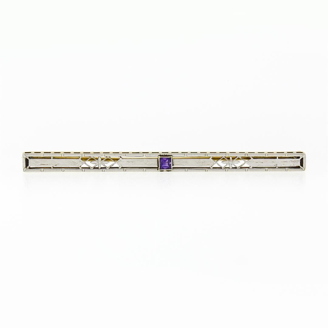 An antique solid 14k yellow gold and platinum bar brooch, with 1 square step cut natural amethyst (0.05ct). Measures 4.34x65.13mm and weighs a total of 3.83 grams.
