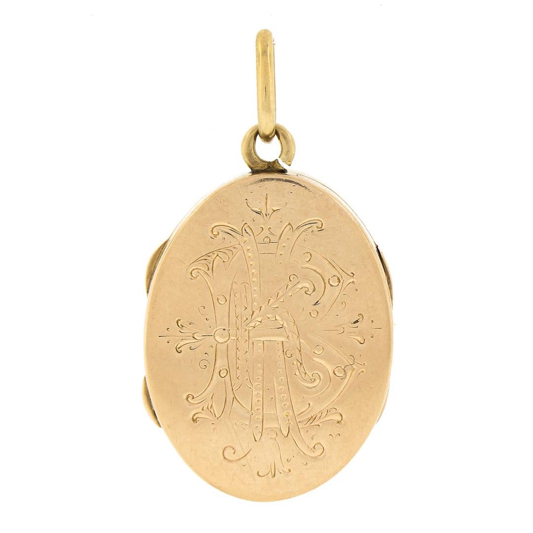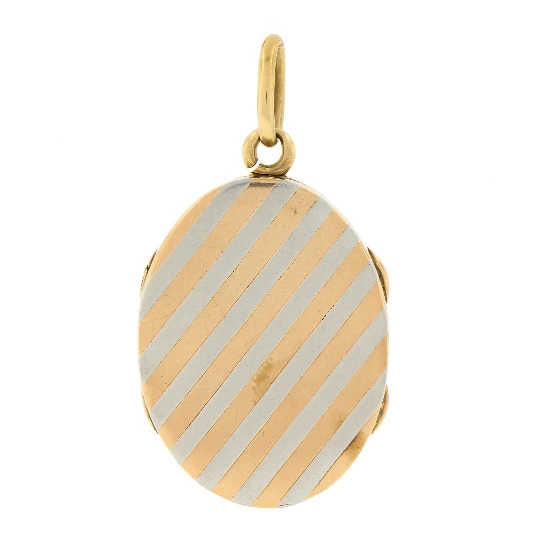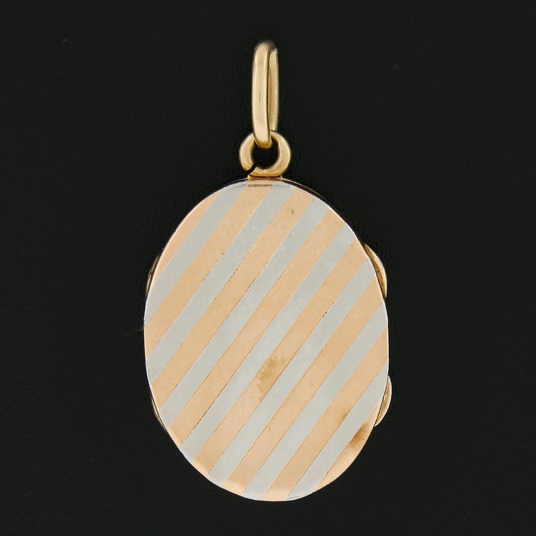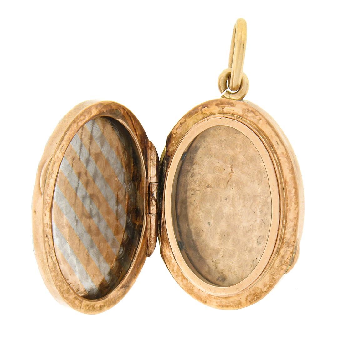 An antique solid 14k rose gold & platinum locket pendant. The pendant weighs a total of 9.50 grams, measures 37.9x20.3mm including the bail, and the inside of the bail measures 6.1x2.5mm, the compartment dimensions: 23x16.3mm each.
