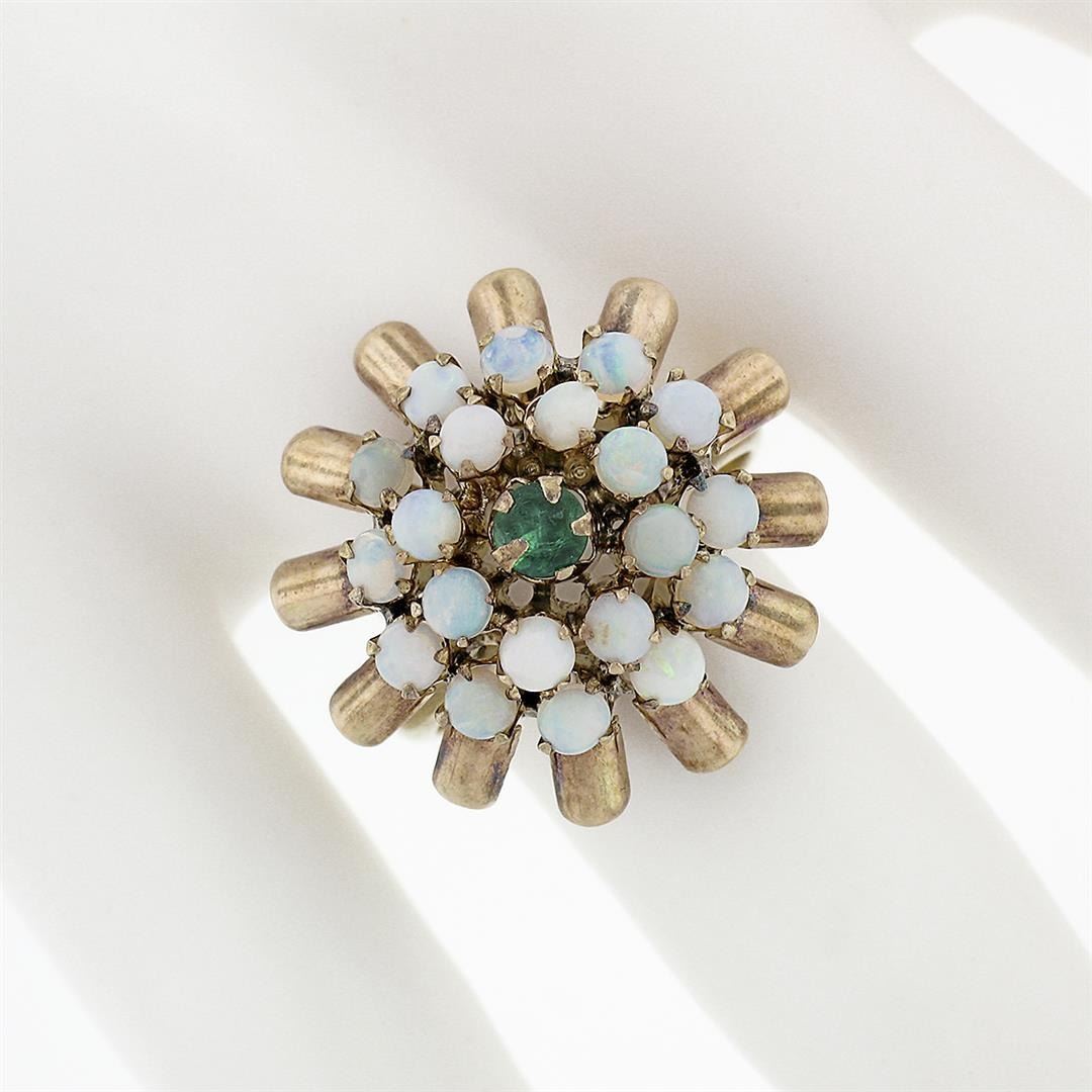 An antique solid 14k rosy yellow gold cluster platter ring, featuring 1 old round cut natural emerald ( 3.55mm - 0.20ctw), surrounded with a halo of 19 round cabochon cut natural opals (2.8mm). The ring is size 7, weighs a total of 4.78 grams, and measures 21.65mm in diameter.