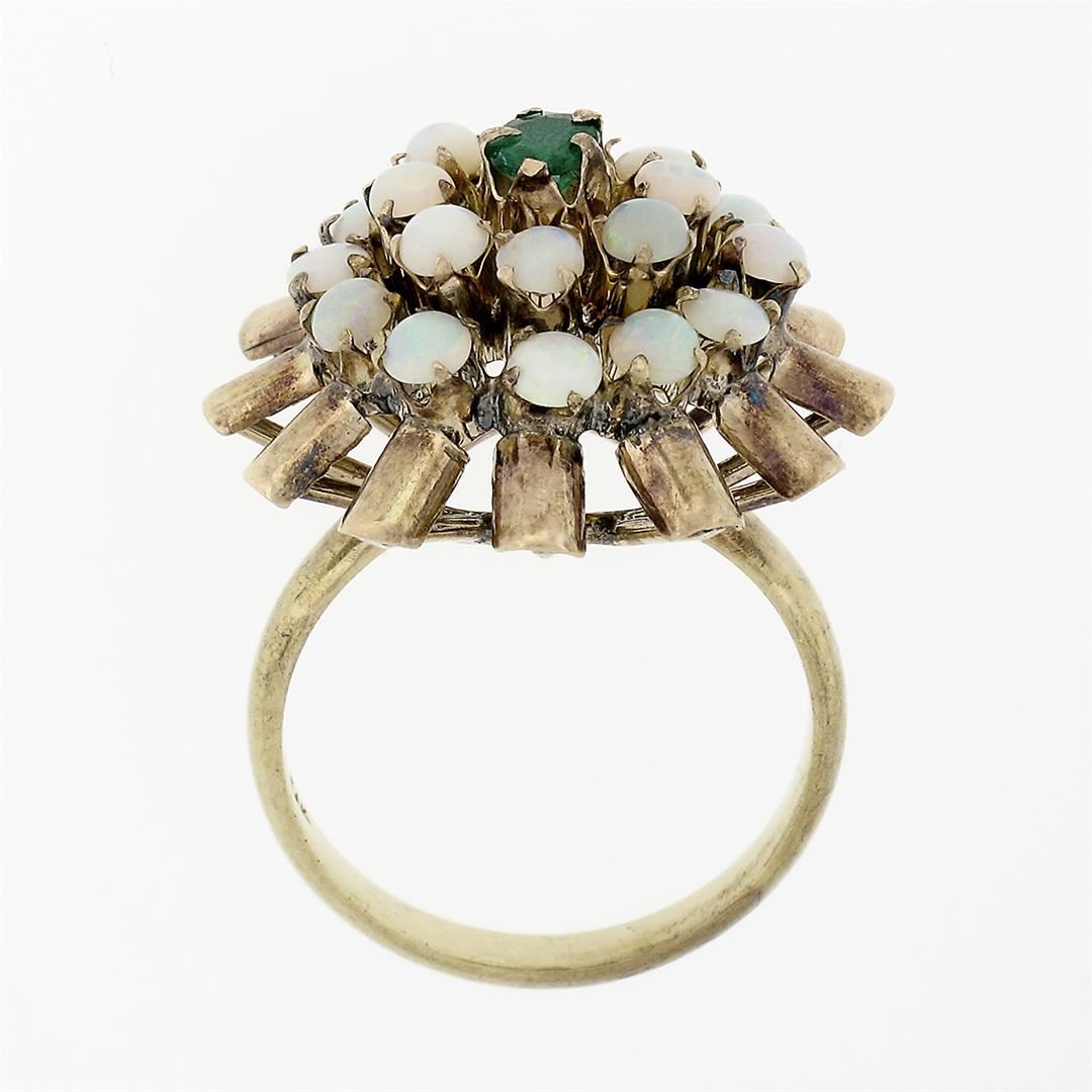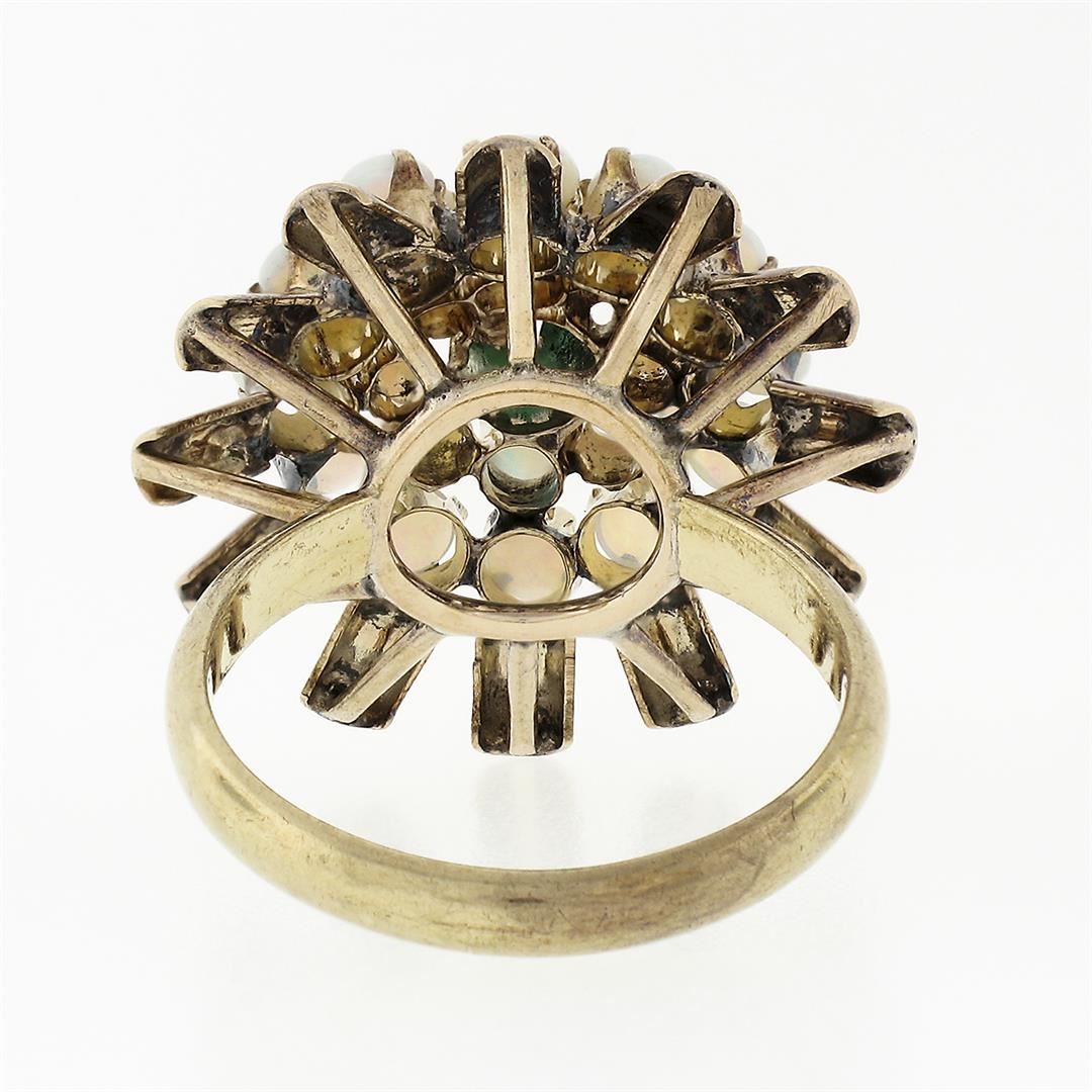 An antique solid 14k rosy yellow gold cluster platter ring, featuring 1 old round cut natural emerald ( 3.55mm - 0.20ctw), surrounded with a halo of 19 round cabochon cut natural opals (2.8mm). The ring is size 7, weighs a total of 4.78 grams, and measures 21.65mm in diameter.