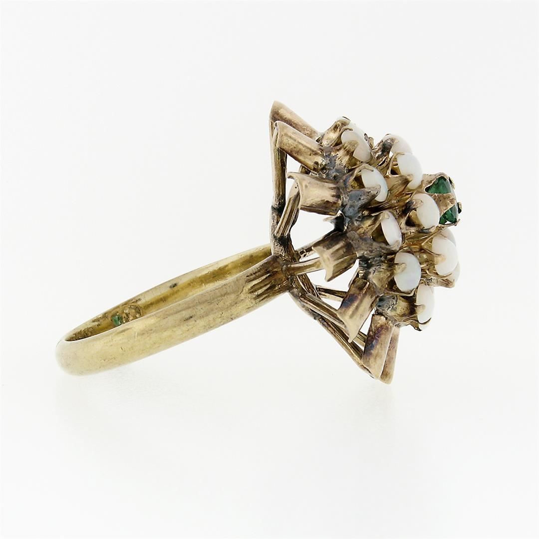 An antique solid 14k rosy yellow gold cluster platter ring, featuring 1 old round cut natural emerald ( 3.55mm - 0.20ctw), surrounded with a halo of 19 round cabochon cut natural opals (2.8mm). The ring is size 7, weighs a total of 4.78 grams, and measures 21.65mm in diameter.