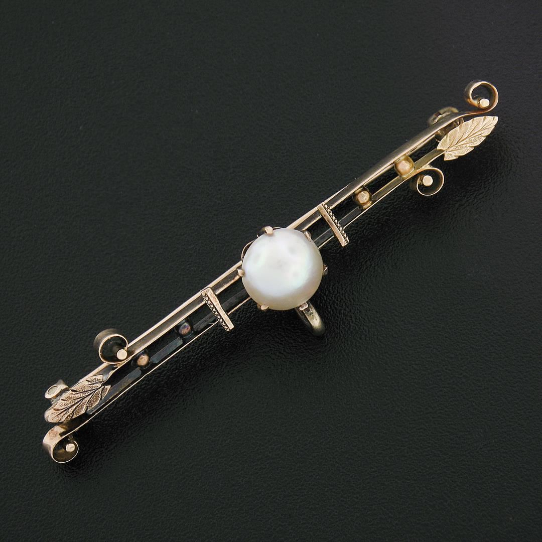 An anrtique solid 14k rosy yellow gold bar pin brooch, with 1 round shape genuine cultured pearl (7.4mm). Measures 11.50x52.1mm and weighs a total of 3.61 grams.