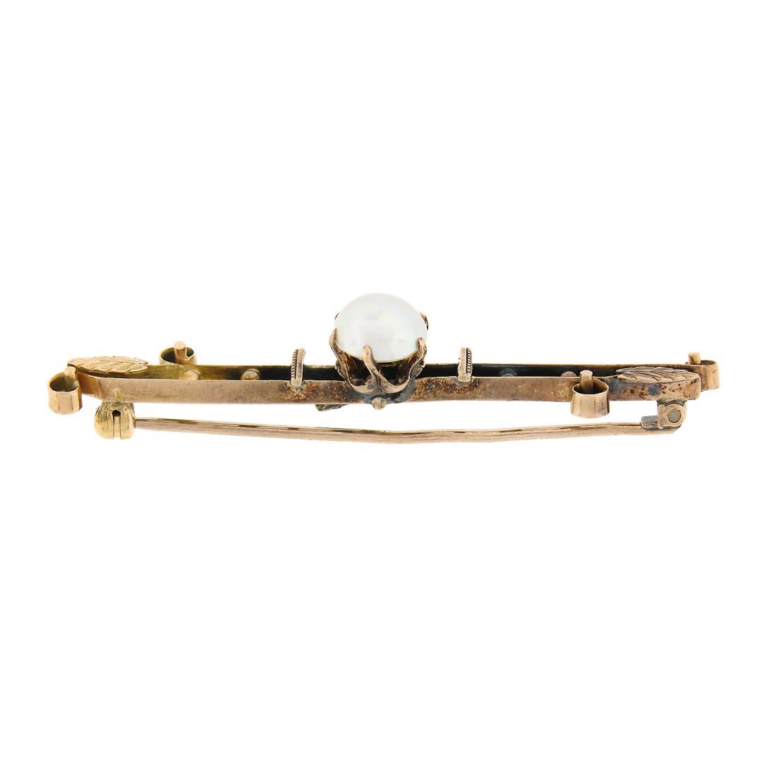 An anrtique solid 14k rosy yellow gold bar pin brooch, with 1 round shape genuine cultured pearl (7.4mm). Measures 11.50x52.1mm and weighs a total of 3.61 grams.