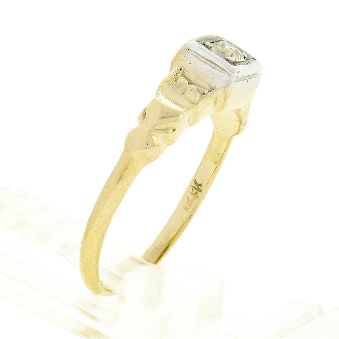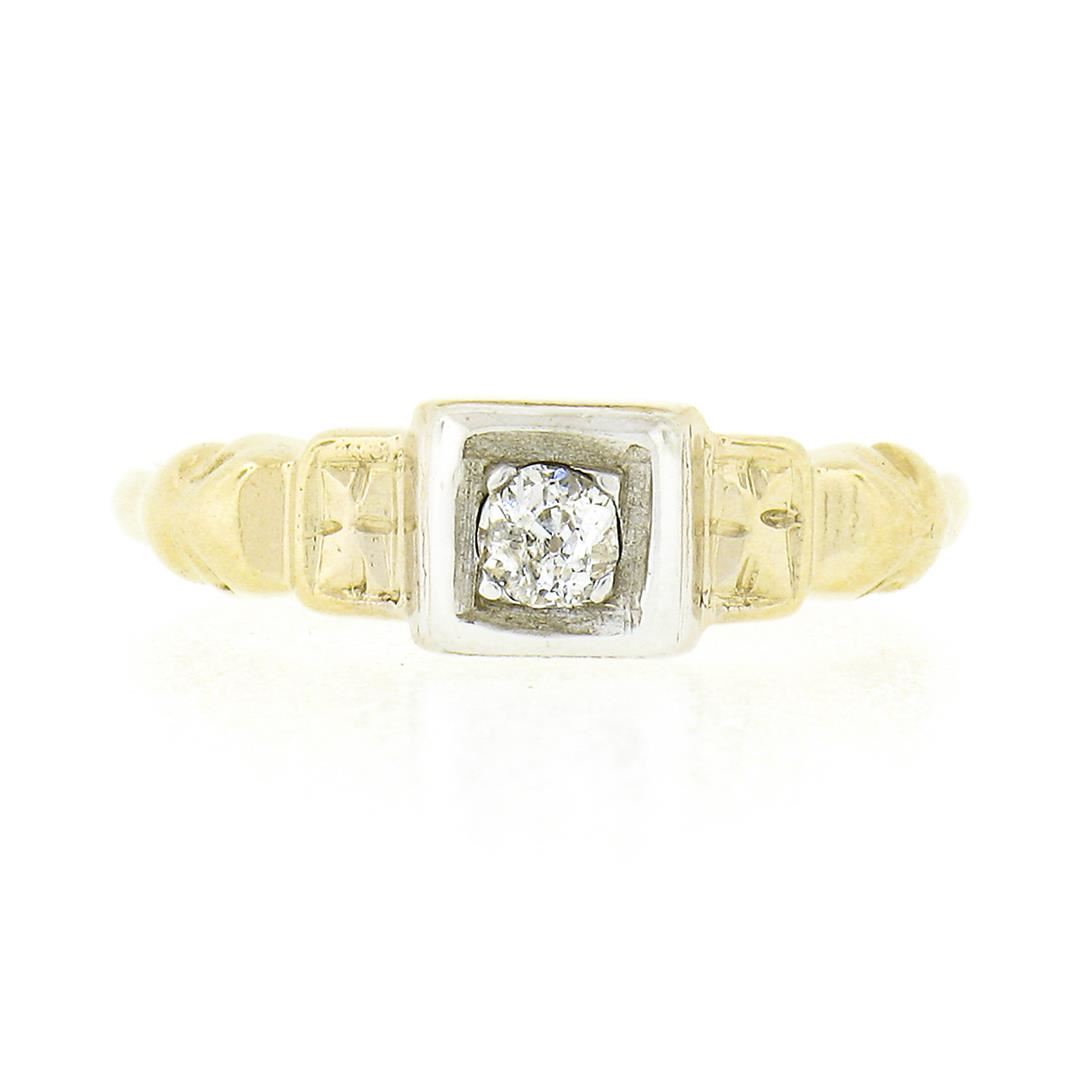 An antique solid 14k yellow and white gold solitaire ring, with 1 old mine cut natural diamond (H- SI2; 0.10ct). The ring is size 5.5, weighs a total of 2.24 grams, and measures 5.25mm wide.