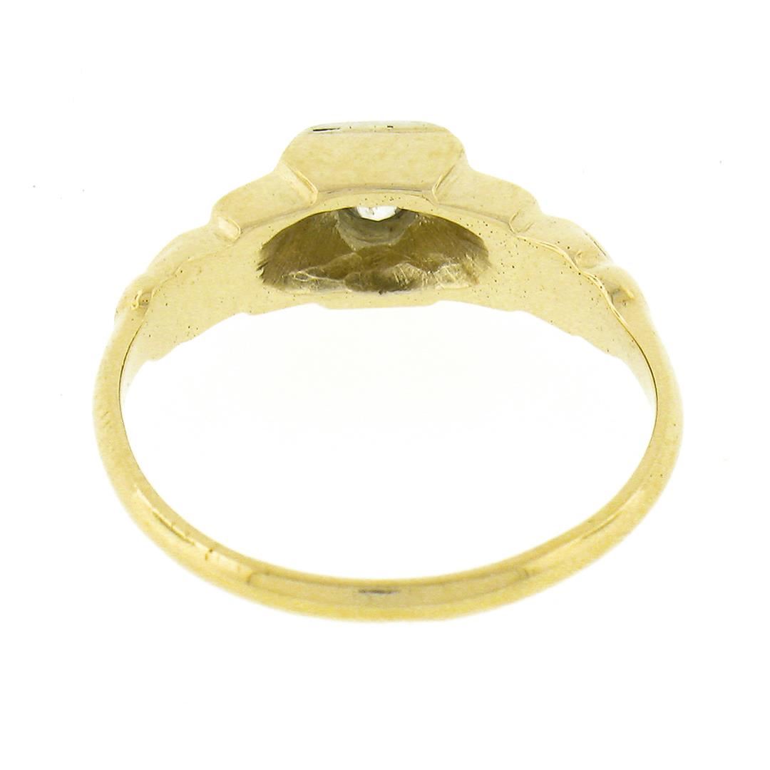 An antique solid 14k yellow and white gold solitaire ring, with 1 old mine cut natural diamond (H- SI2; 0.10ct). The ring is size 5.5, weighs a total of 2.24 grams, and measures 5.25mm wide.