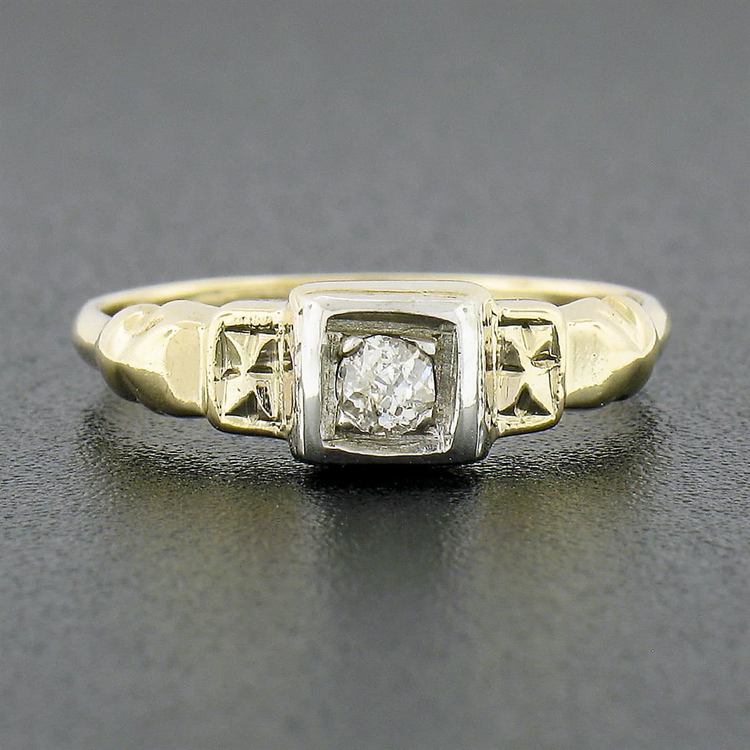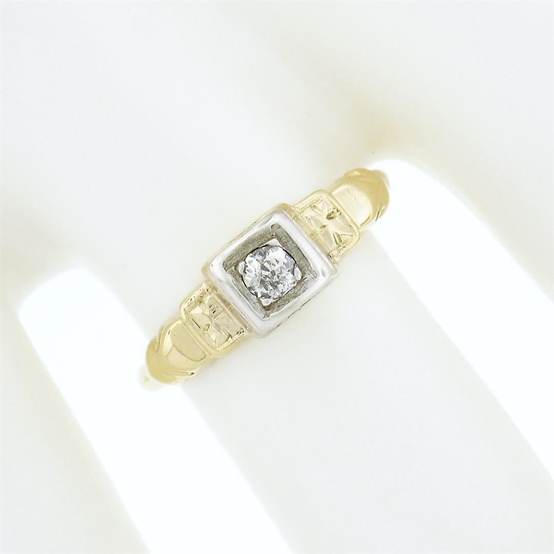 An antique solid 14k yellow and white gold solitaire ring, with 1 old mine cut natural diamond (H- SI2; 0.10ct). The ring is size 5.5, weighs a total of 2.24 grams, and measures 5.25mm wide.