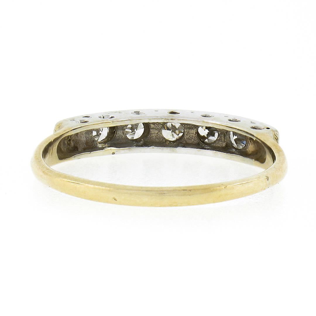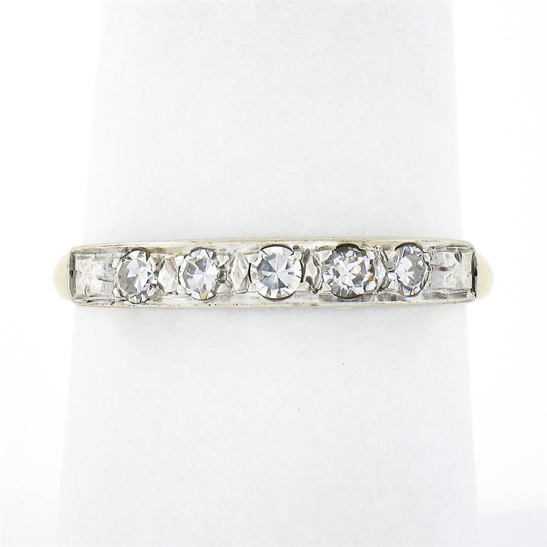 An antique solid 14k yellow and white gold band ring, with 5 old single cut natural diamonds (G/H - VS1/VS2 ; 0.30ctw). The ring is size 8.0, weighs a total of 1.97 grams, and measures 3.20mm wide.