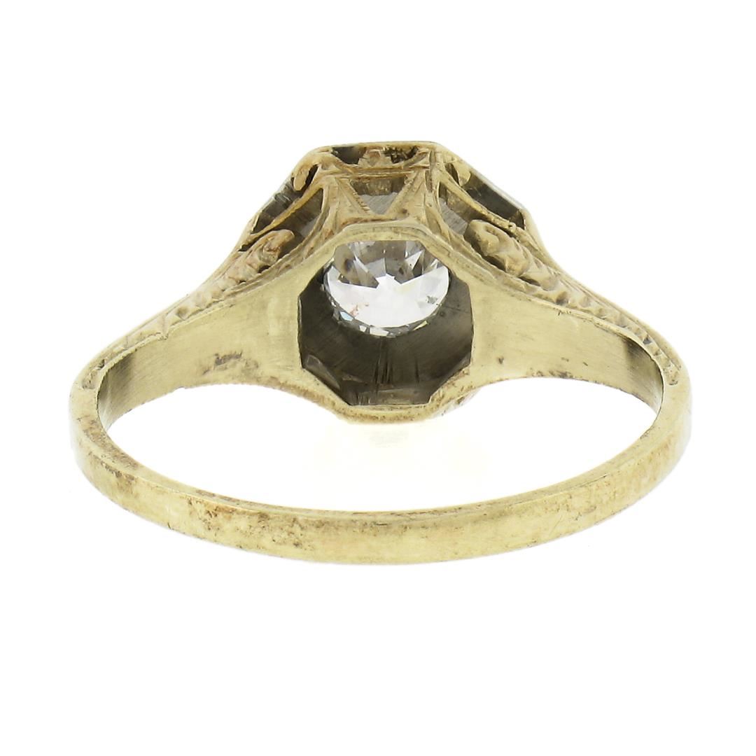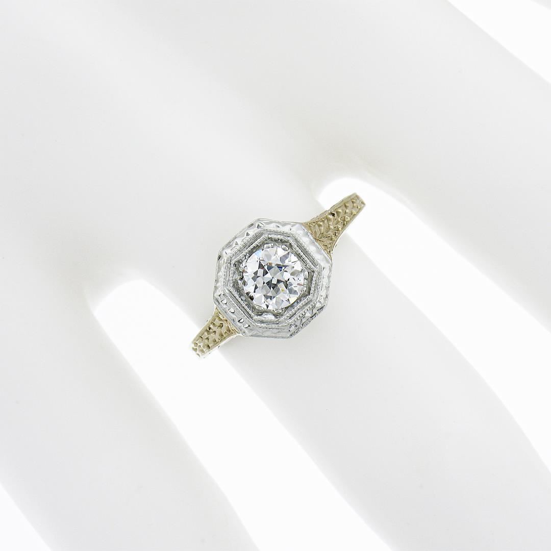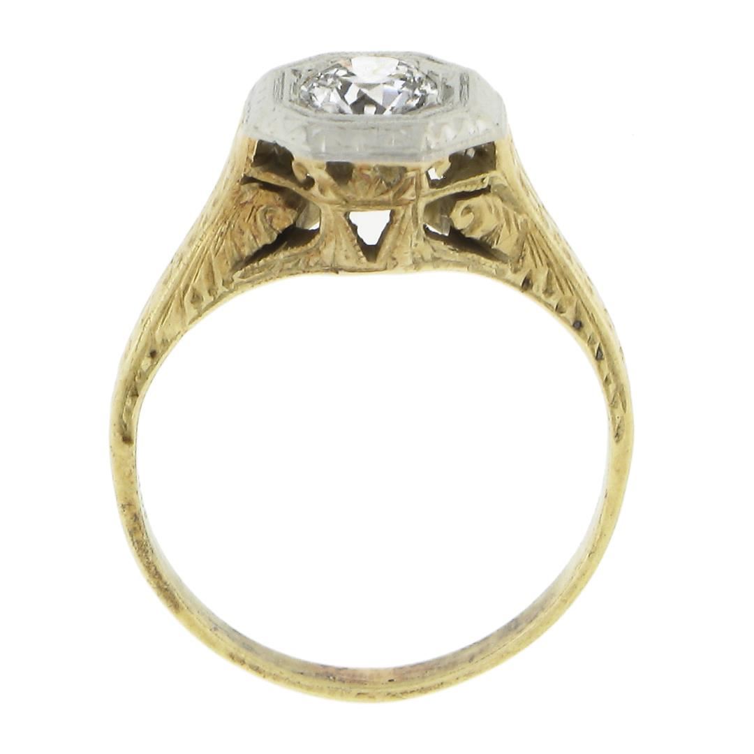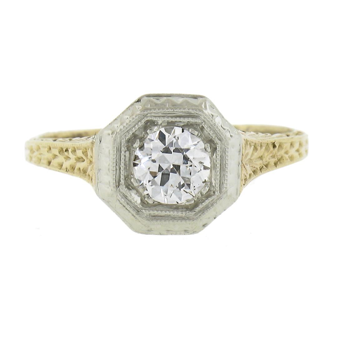 An antique solid 14k yellow & white gold soliatire engagement ring, with 1 old european cut natural diamond ( G - SI1 ; 0.40ct). The ring is size 5.25, weighs a total of 3 grams, and measures 8.5mm wide.