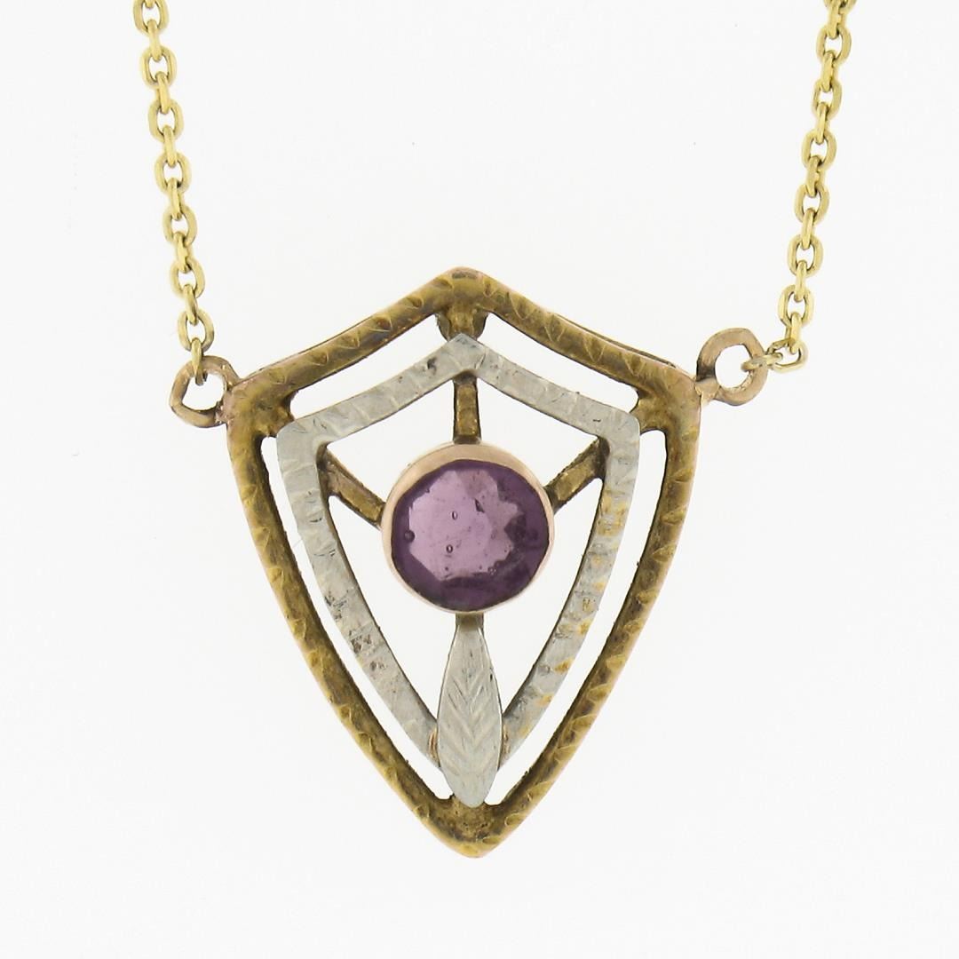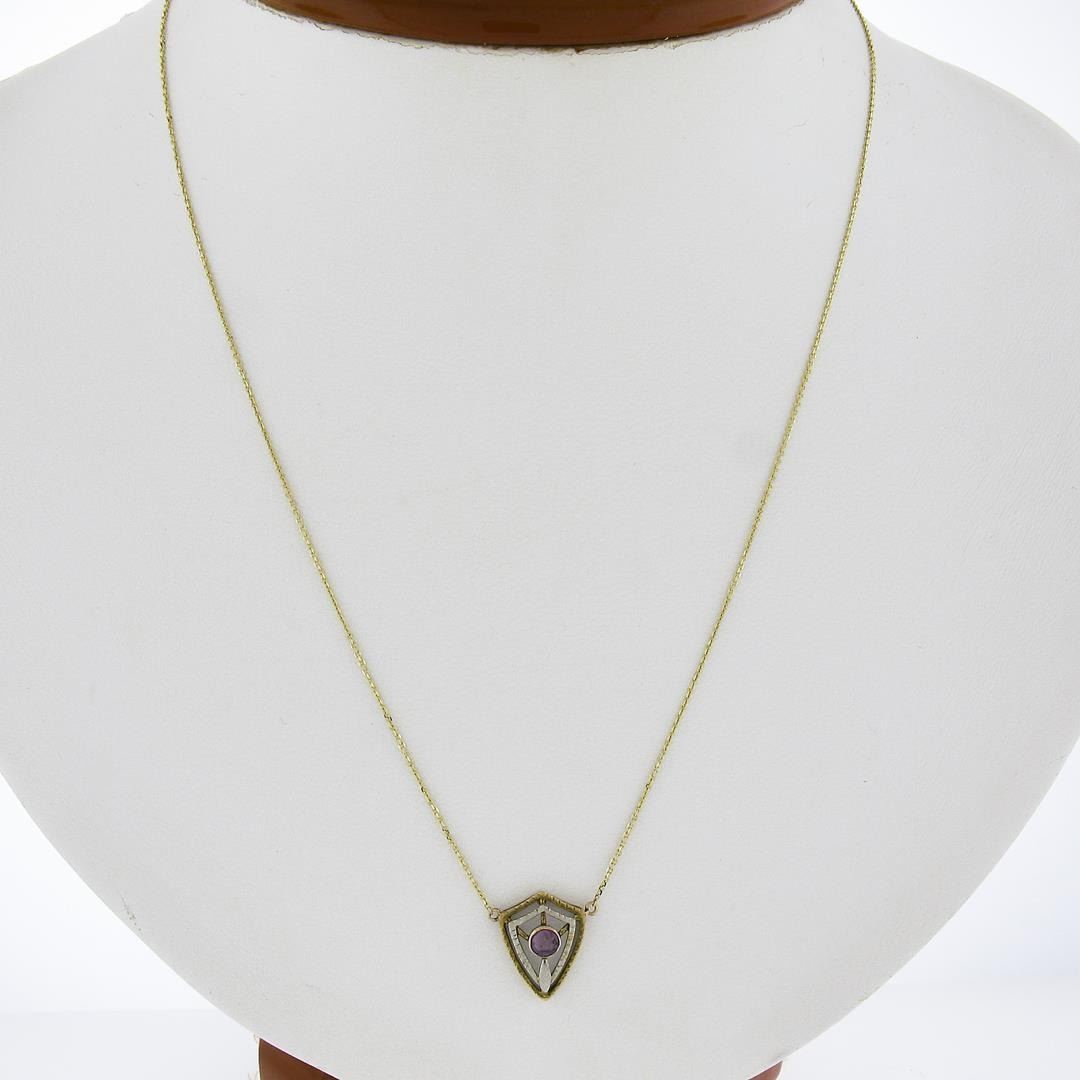 Antique 14k TT Gold Purple Stone Open Work Petite Shield Pendant w/ Cable Chain