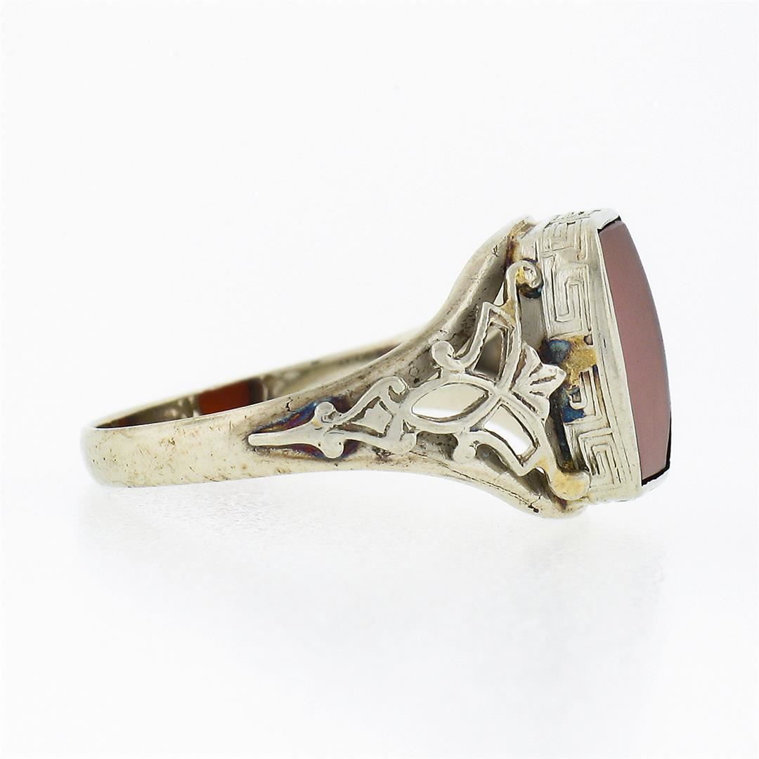 An antique solid 14k white gold ring, with 1 custom cut natural carnelian (9.4x7.5mm). The ring is size 5.5, weighs a total of 2.41 grams, and measures 11.10mm wide.