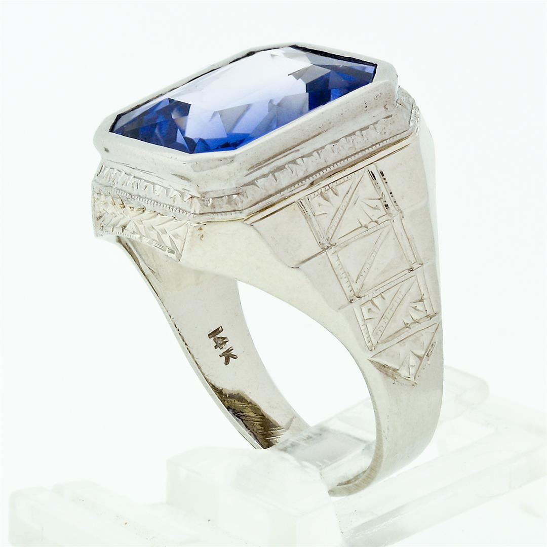 A solid 14k white gold ring, with 1 faceted cut cornered rectangular shape blue stone (14.5x12.5mm). The ring is size 10.0, weighs a total of 10.24 grams, and measures 19.5mm wide.
