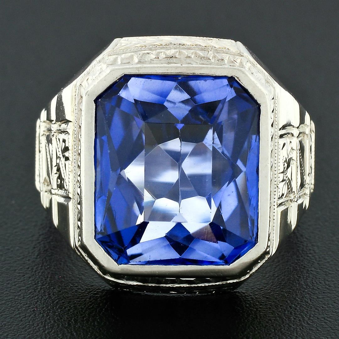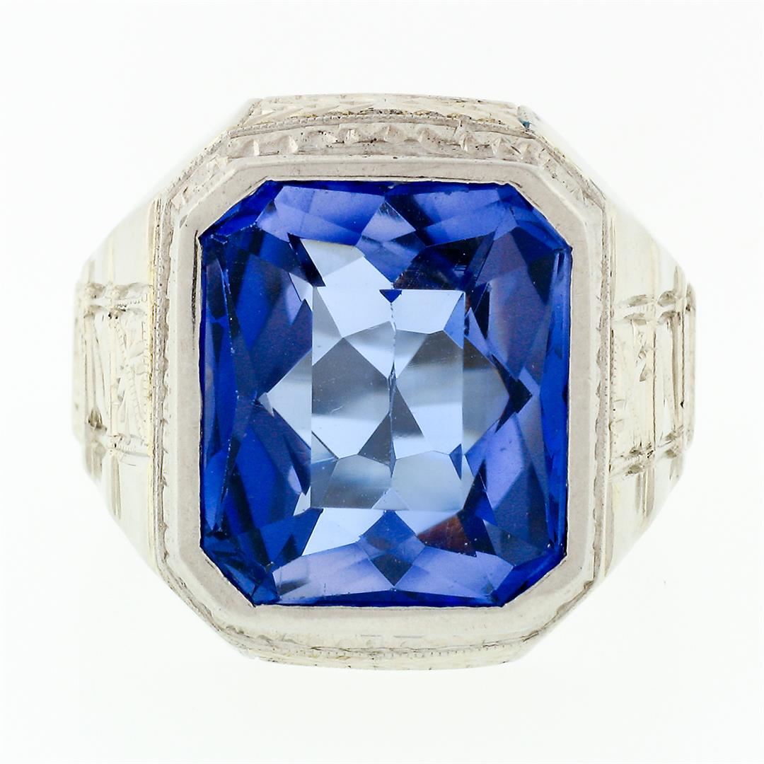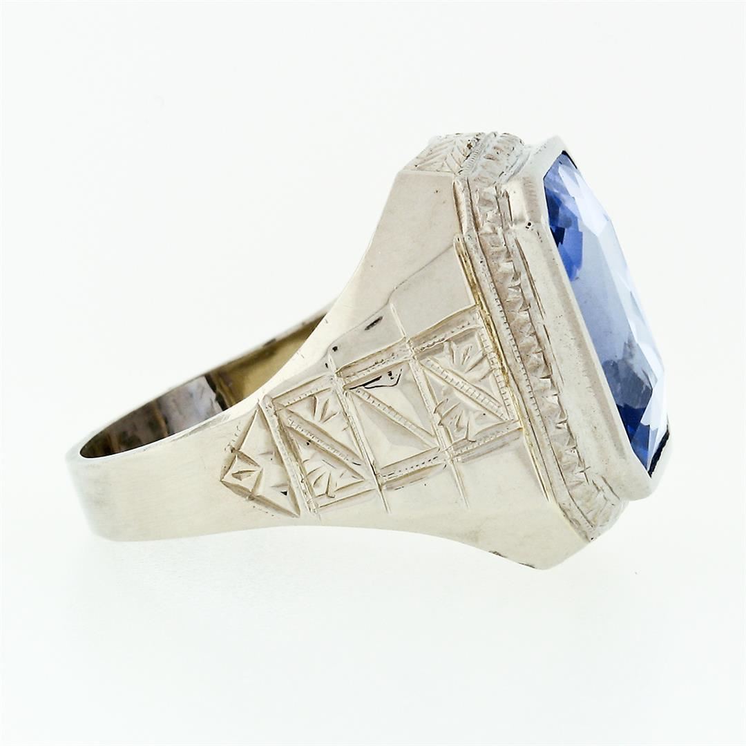 A solid 14k white gold ring, with 1 faceted cut cornered rectangular shape blue stone (14.5x12.5mm). The ring is size 10.0, weighs a total of 10.24 grams, and measures 19.5mm wide.
